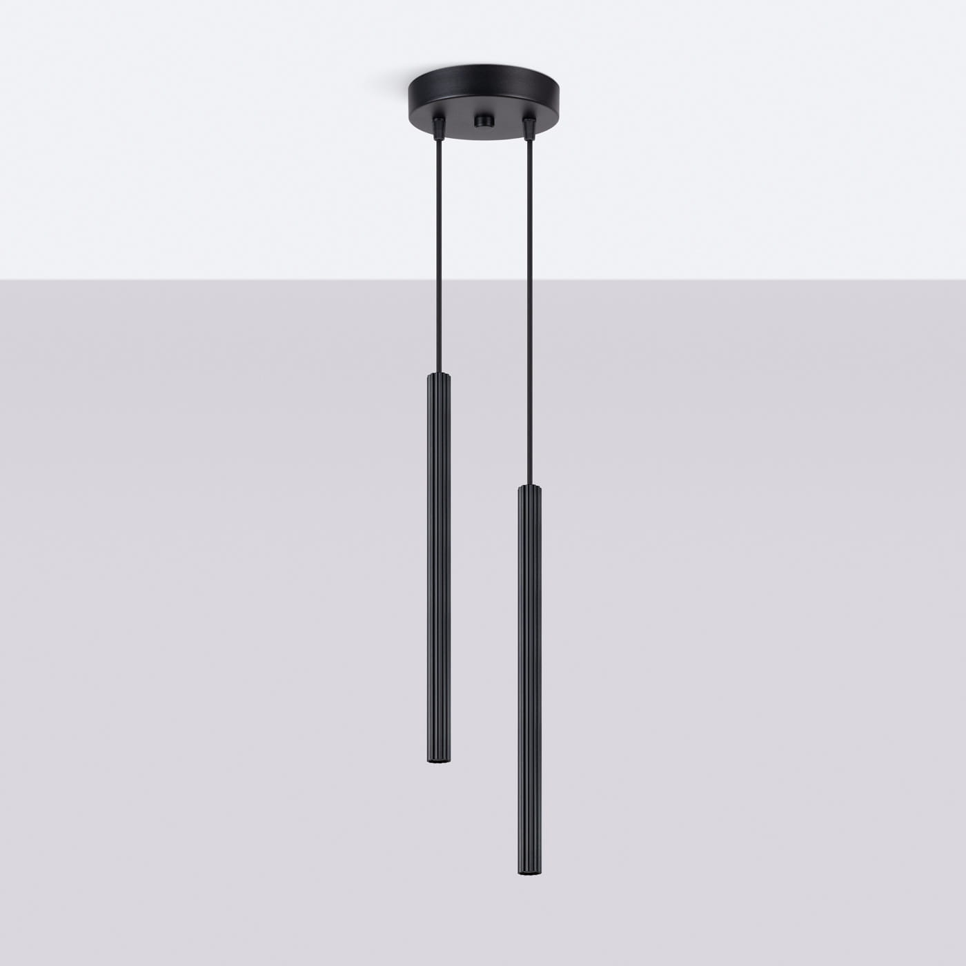 Czarna lampa wisząca podwójna tuby sufitowe ryflowane 2xG9 ARCHE 2P - dwie smukłe tuby sufitowe ryflowane wiszące zamocowane do okrągłej podsufitki. Lampa wisząca o nowoczesnym, efektownym wyglądzie i bardzo uniwersalnym zastosowaniu. Pięknie zaprezentuje się jako lampa nad stół, lampa nad wyspę kuchenną, ale również jako lampa wisząca w łazience czy sypialni przy łóżku.