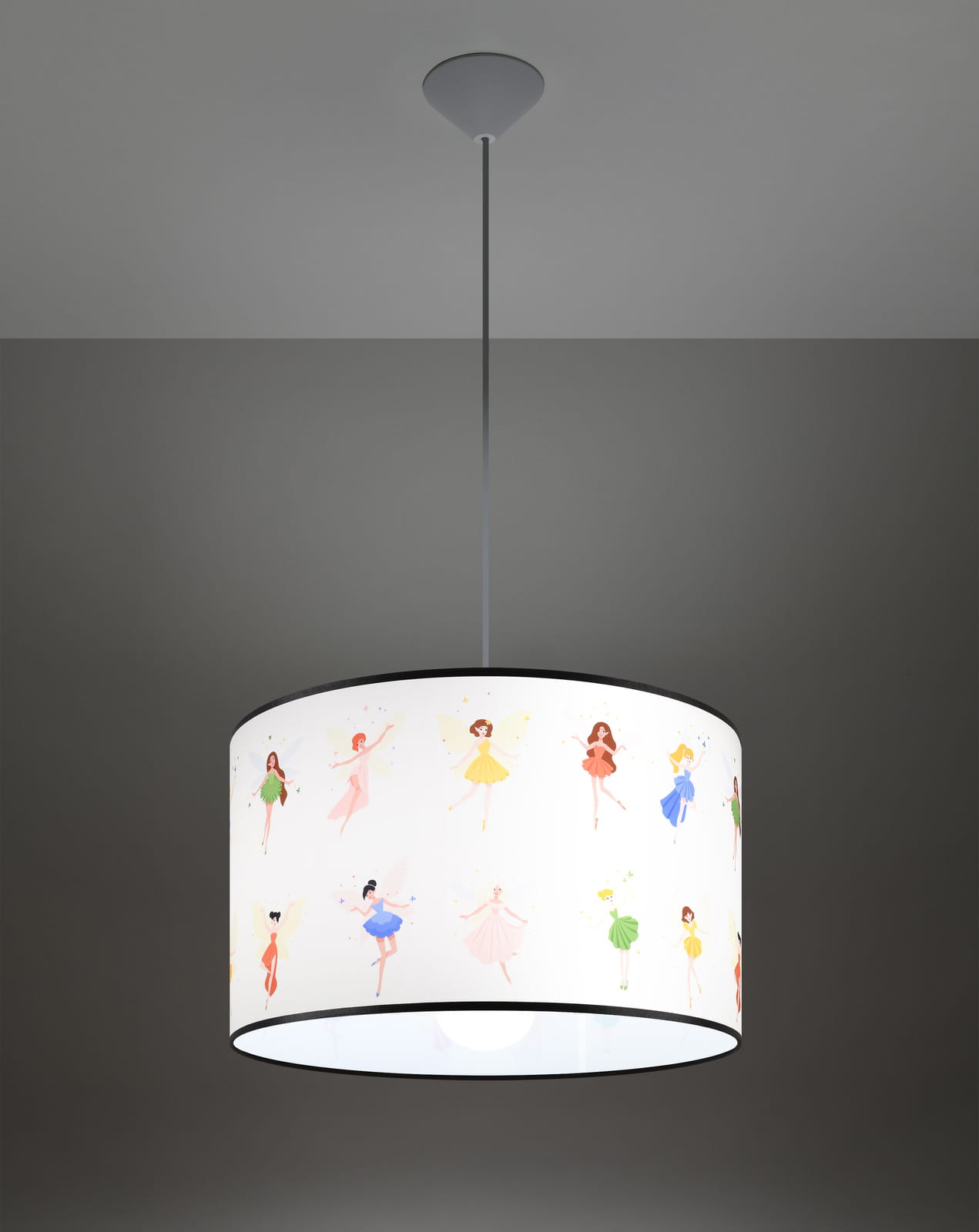 Lampa dla dziewczynki wisząca FAIRY jest funkcjonalna, estetyczna, dzięki czemu staje się idealną dekoracją wnętrza. Będzie doskonale komponować się z kolorowymi meblami czy wzorzystymi ścianami. Połączenie żywych kolorów postaci z jasnym tłem i prostym, klasycznym kształtem klosza daje wyważony efekt wizualny, który nie przytłacza wnętrza. Lampa, choć dziecięca, pozostaje jednocześnie stylowa i przyjemna również dla oka dorosłych.