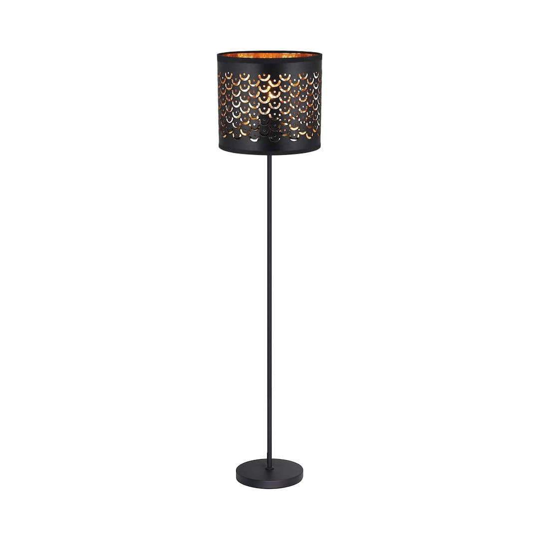 Lampa podłogowa stojąca czarna ze złotym 1xE27 MORGAN - efektowna lampa podłogowa, niezbędna jako uzupełnienie każdej przytulnej aranżacji. Lampa do salonu, lampa stojąca do sypialni z czarnym ażurowanym kloszem.