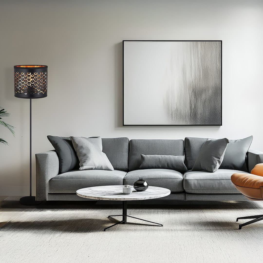 Czarna lampa podłogowa MORGAN to wyjątkowy dodatek do sypialni lub salonu - ażurowy klosz w kolorze czarnym, z ciepłym złotym wnętrzem, wypełnia pomieszczenie przyjemnym, nastrojowym światłem, tworząc atmosferę sprzyjającą relaksowi. Elegancka lampa podłogowa MORGAN to połączenie klasycznej formy z nowoczesnym wykończeniem.