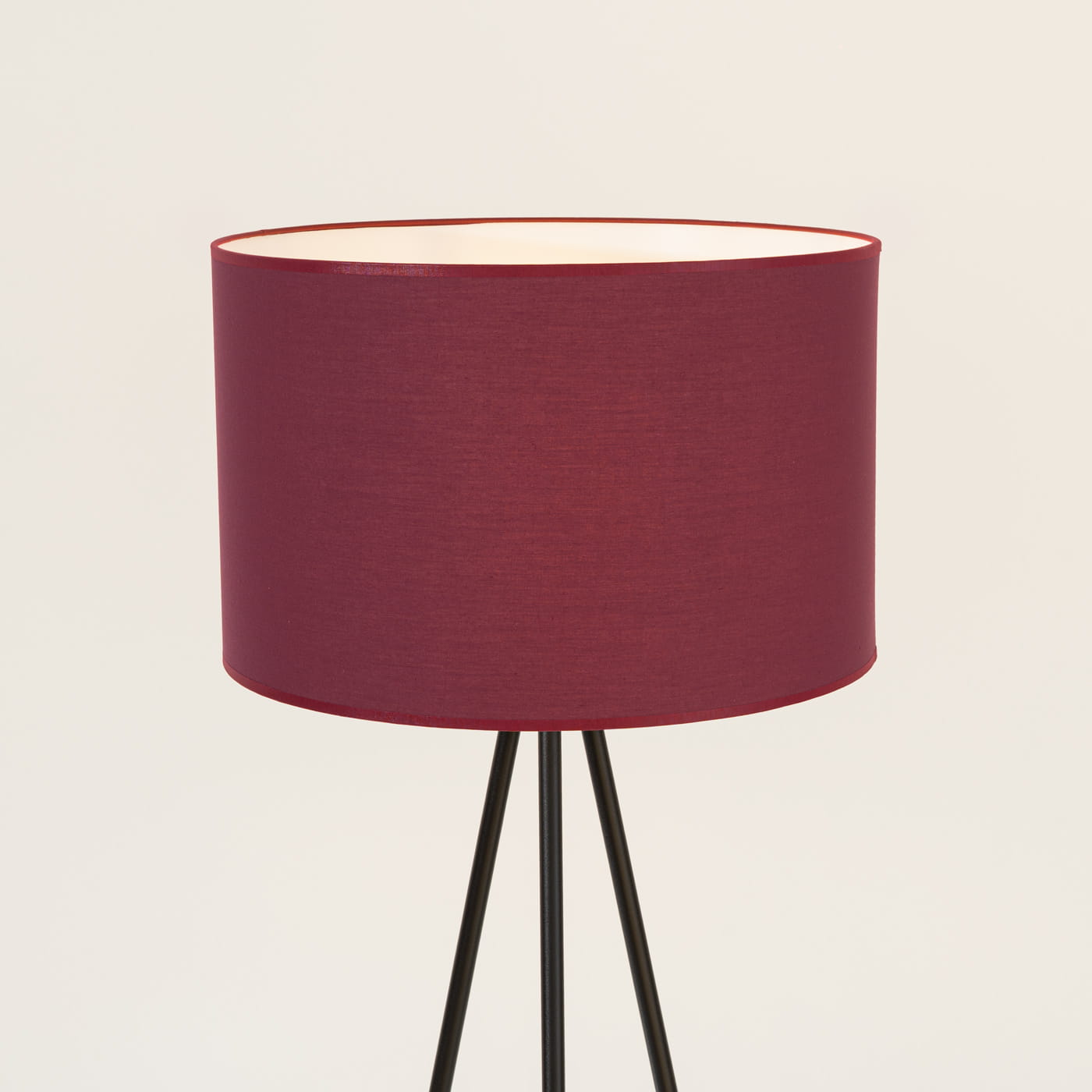 Lampa stojąca podłogowa trójnóg NEVIA burgund - efektowna lampa stojąca do salonu, lampa stojąca do sypialni, lampa podłogowa, która doświetla, robi klimat i zdobi. Lampa podłogowa, która łączy ponadczasowy design z nowoczesnymi akcentami. Cylindryczny abażur doskonale współgra z subtelną, czarną metalową konstrukcją.