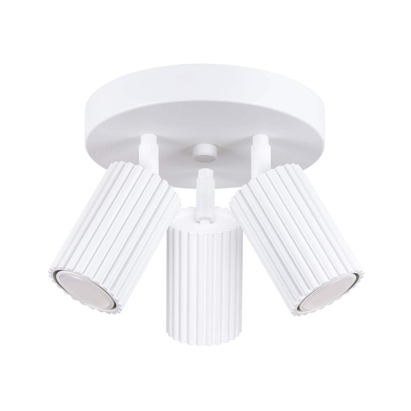 Lampa sufitowa biała ryflowana 3xGU10, plafon KARBON 3P spot - potrójna lampa sufitowa z regulowanymi reflektorkami typu spot. Białe tuby sufitowe ryflowane zamocowane za pomocą ruchomych głowic do okrąglej podsufitki. Lampa sufitowa na korytarz, lampa do przedpokoju, lampa do kuchni - idealna do doświetlania różnych stref wnętrza.