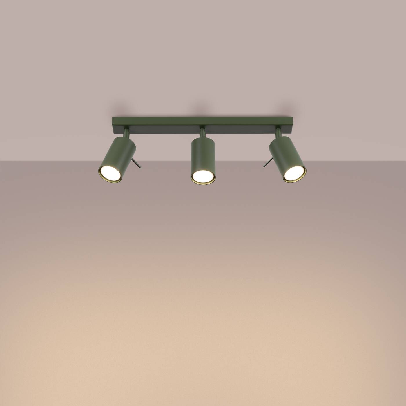 Lampa sufitowa spot 3xGU10 plafon zielony oliwkowy RING 3L - potrójna lampa przysufitowa typu spot w fantastycznym oliwkowym kolorze. Trzy niewielkie tuby regulowane zamocowane za pomocą ruchomych głowic do podsufitki w kształcie listwy. Lampa na przedpokój, lampa kuchenna ale również lampa do salonu idealna do doświetlenia ulubionej strefy. Nowoczesny minimalizm z funkcjonalnością - cylindryczny kształt reflektorów w połączeniu z minimalistyczną formą sprawia, że lampa sufitowa potrójna regulowana doskonale odnajduje się w nowoczesnych i industrialnych wnętrzach, podkreślając ich charakter.