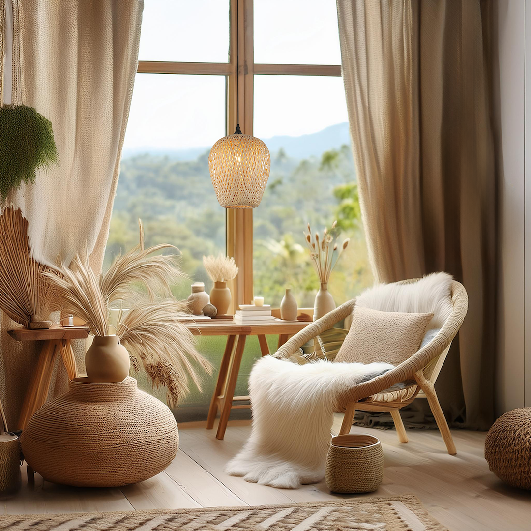 Lampa sufitowa wisząca, lampa BOHO – harmonijne połączenie elegancji i naturalnego uroku. Bambusowa lampa wisząca posiada klosz, wykonany z materiału o strukturze inspirowanej rękodziełem, emituje ciepłe, rozproszone światło, które wprowadza do wnętrza przytulny i wyrafinowany nastrój. Jego organiczny kształt sprawia, iż lampa BOHO jest delikatna, a subtelne detale i czarne wykończenie podkreślają jej nowoczesny charakter. Doskonale komponuje się z wnętrzami inspirowanymi naturą, stylem boho lub rustykalnymi akcentami. Lampa w stylu boho ALMA zaprojektowana z dbałością o każdy szczegół, łącząc wysoką jakość wykonania z estetycznym wyglądem.
