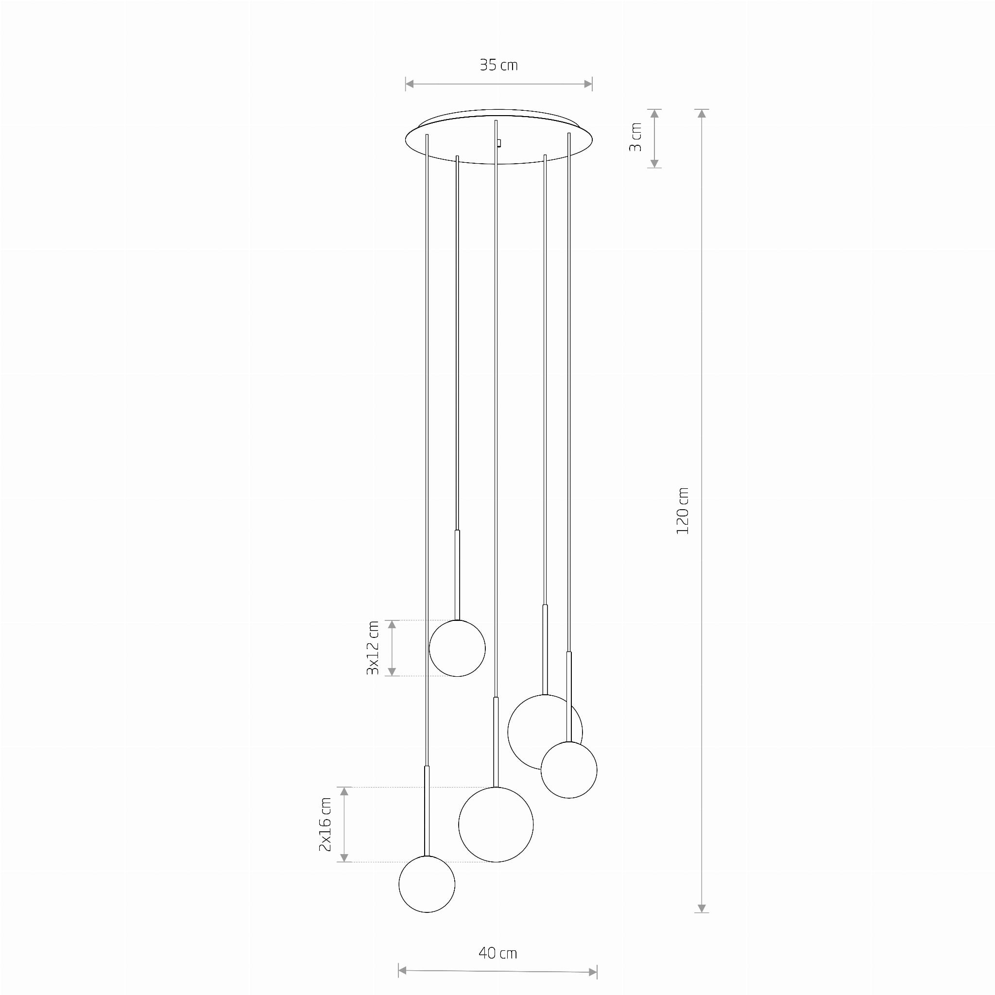 Lampa wisząca czarna ze złotym 120 cm klosze białe kule 5xG9 KARO - klosze białe kule o różnej średnicy zamocowane na zawiesiach ze złotym elementem do czarnej okrągłej podsufitki. Lampa do salonu, lampa nad okrągły stół do jadalni, lampa na klatkę schodową. Lampa sufitowa wisząca do nowoczesnych wnętrz urządzonych gustownie i elegancko.