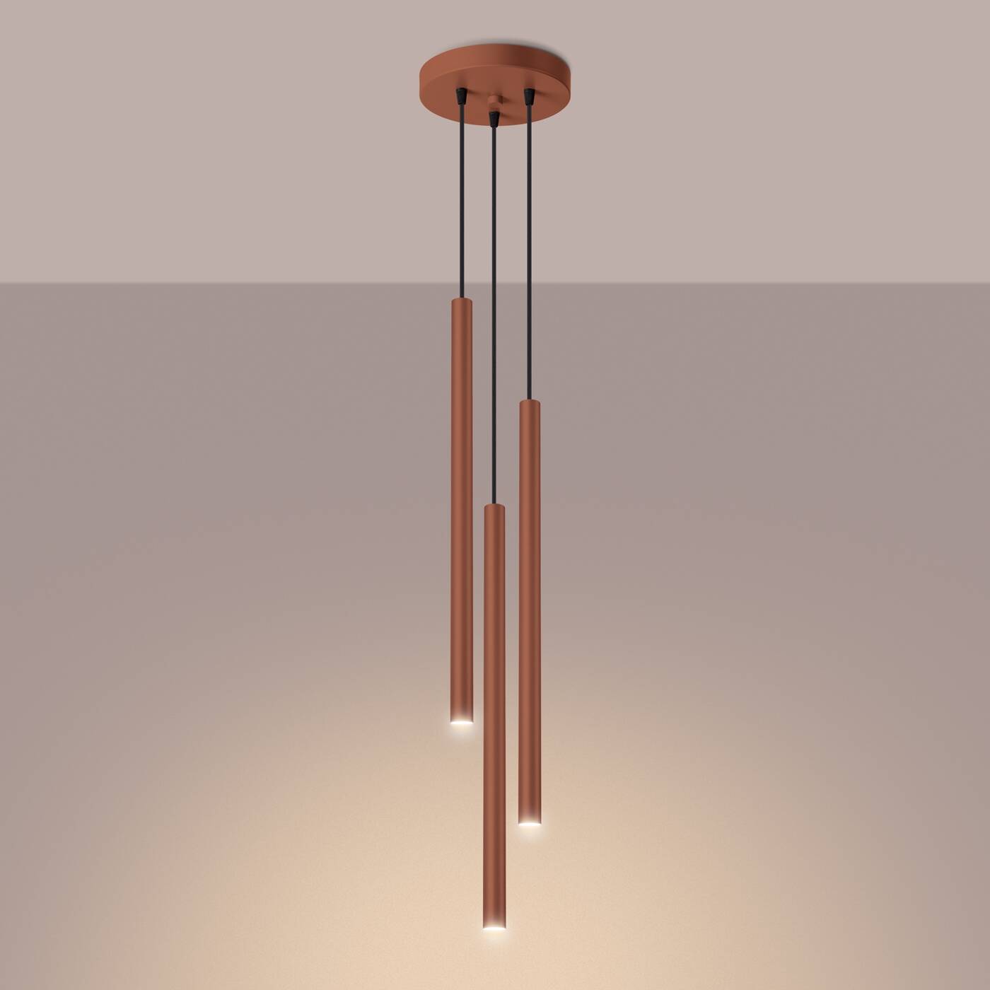 Lampa wisząca potrójna tuby sufitowe PASTELO 3P ochra czerwona - nowoczesne tuby sufitowe wiszące zamocowane do okrągłej podsufitki w nowym, modnym kolorze ochry czerwonej. Nowoczesna lampa nad okrągły stół do jadalni, lampa do salonu urządzonego z dużym wyczuciem estetyki.