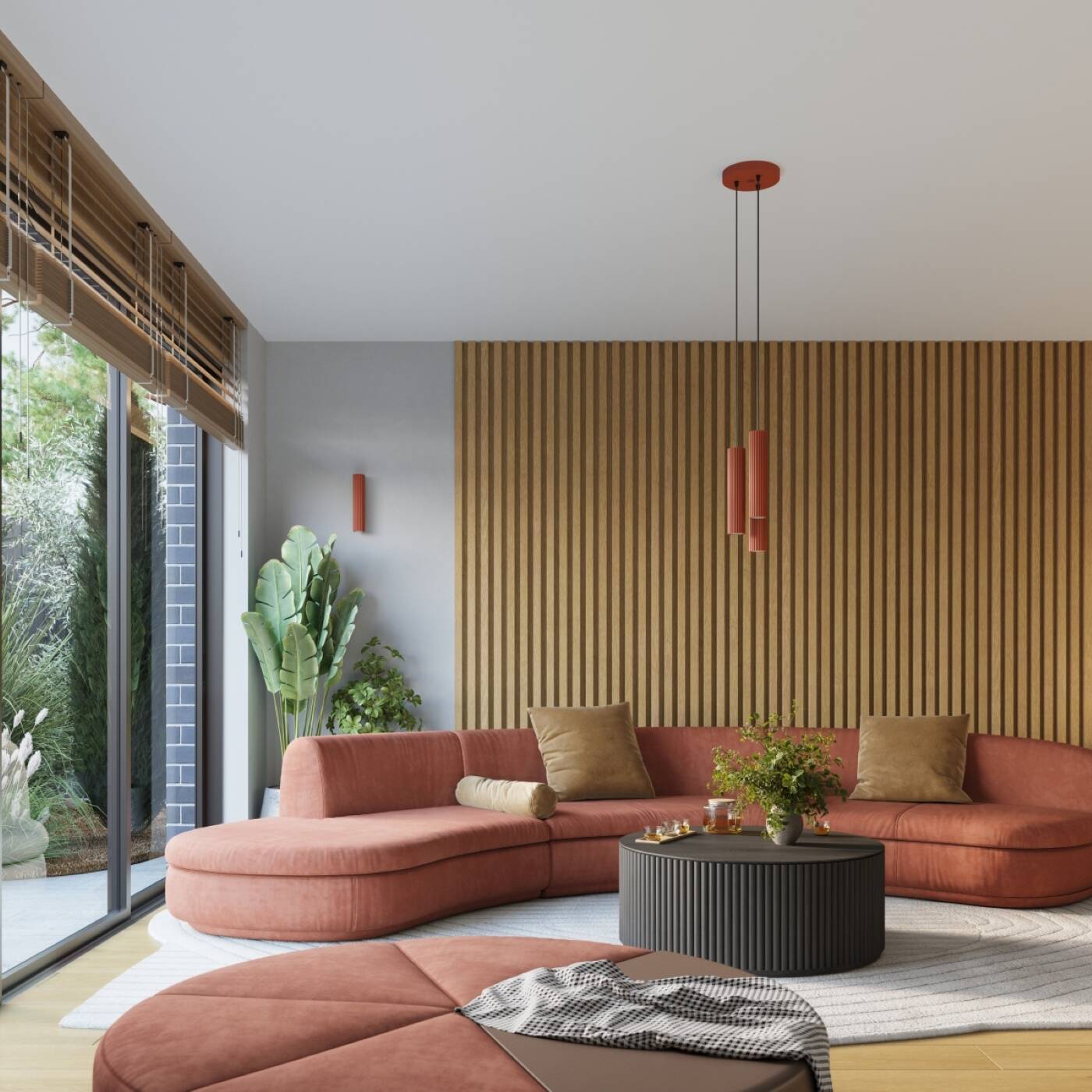 Lampa wisząca tuby sufitowe potrójne w kolorze czerwona ochra o wyjątkowej ryflowanej strukturze, idealna do aranżacji w nowoczesnych przestrzeniach.