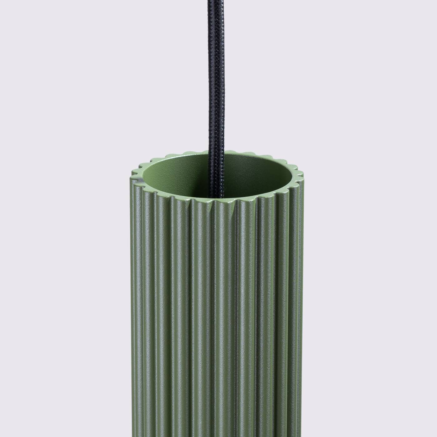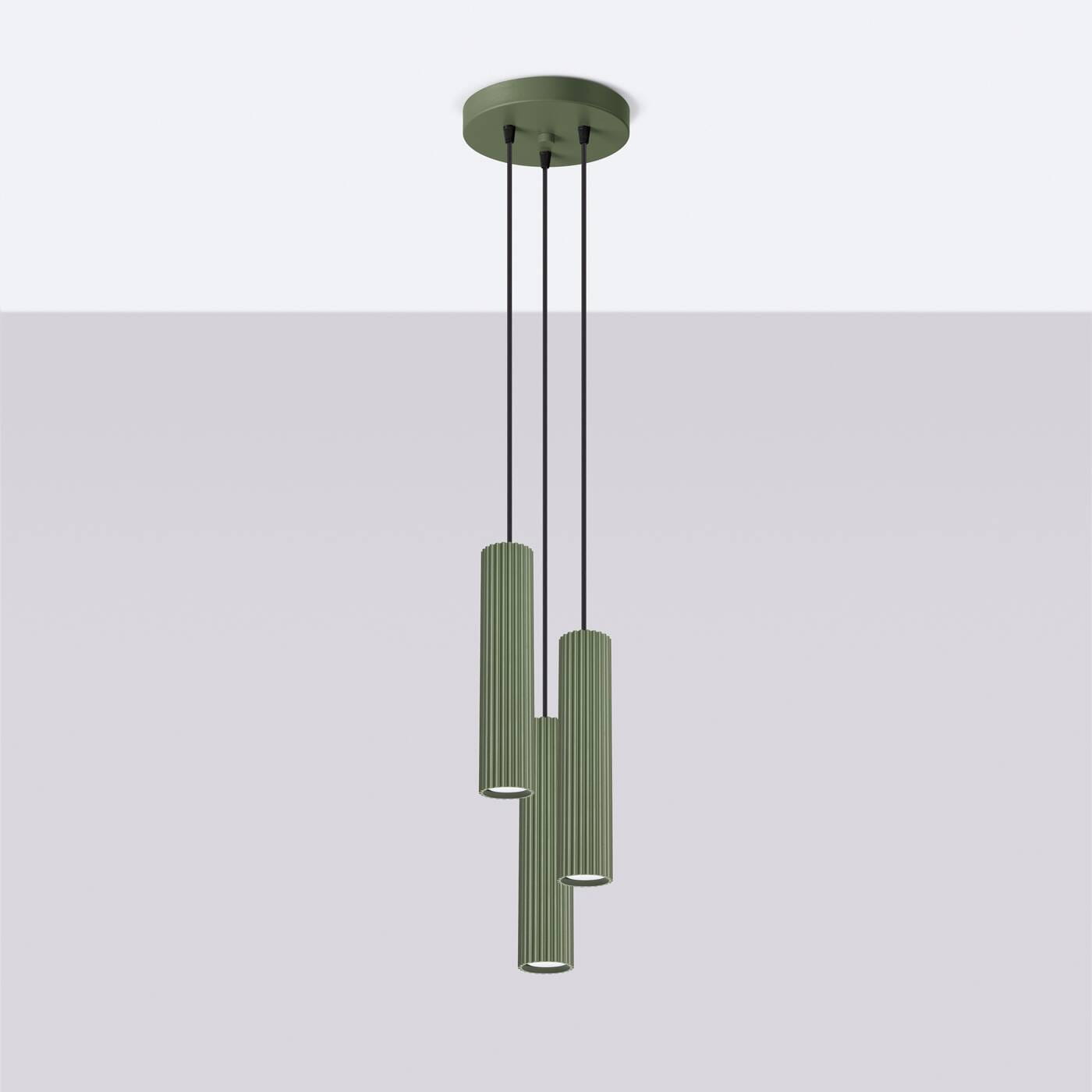 Lampa wisząca tuby sufitowe potrójne w kolorze zielona oliwka o wyjątkowej ryflowanej strukturze, idealna do aranżacji w nowoczesnych przestrzeniach.