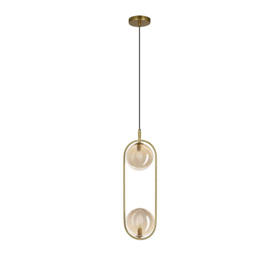 Złota lampa wisząca CORDEL 2x28W to stylowe połączenie mosiężnego wykończenia i bursztynowych kloszy, które tworzą ciepłą i elegancką atmosferę w każdym wnętrzu.
