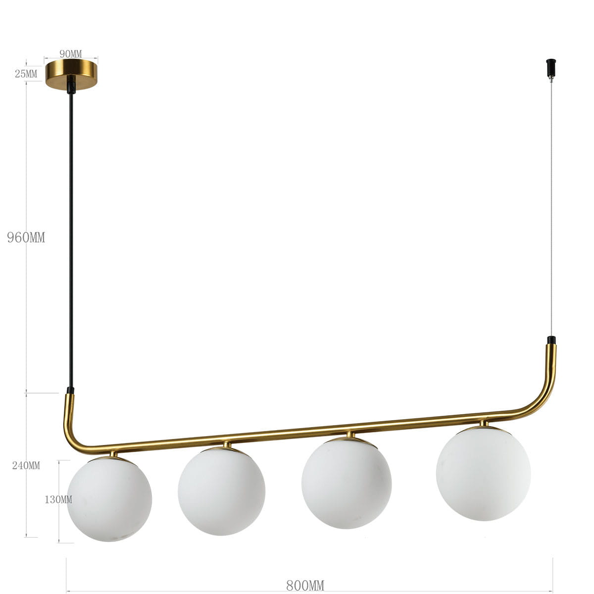Lampa wisząca złota klosze białe kule ALISA 4 to elegancki i funkcjonalny dodatek do każdego wnętrza, wykonany z metalu w kolorze złota i wyposażony w cztery szklane klosze. Mleczne klosze szklane kule zapewniają delikatne, rozproszone światło, tworząc przyjemną atmosferę w pomieszczeniu.