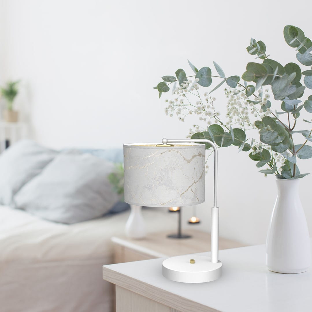 Lampka nocna do sypialni biała ze złotym SENSO White/Gold 1xE27 - zgrabna, biała lampa stołowa z dodatkiem złotych detali i przebarwień na kloszu. Lampka do sypialni, lampka do salonu - biała lampa stołowa, która będzie świetnym uzupełnieniem gustownej aranżacji.