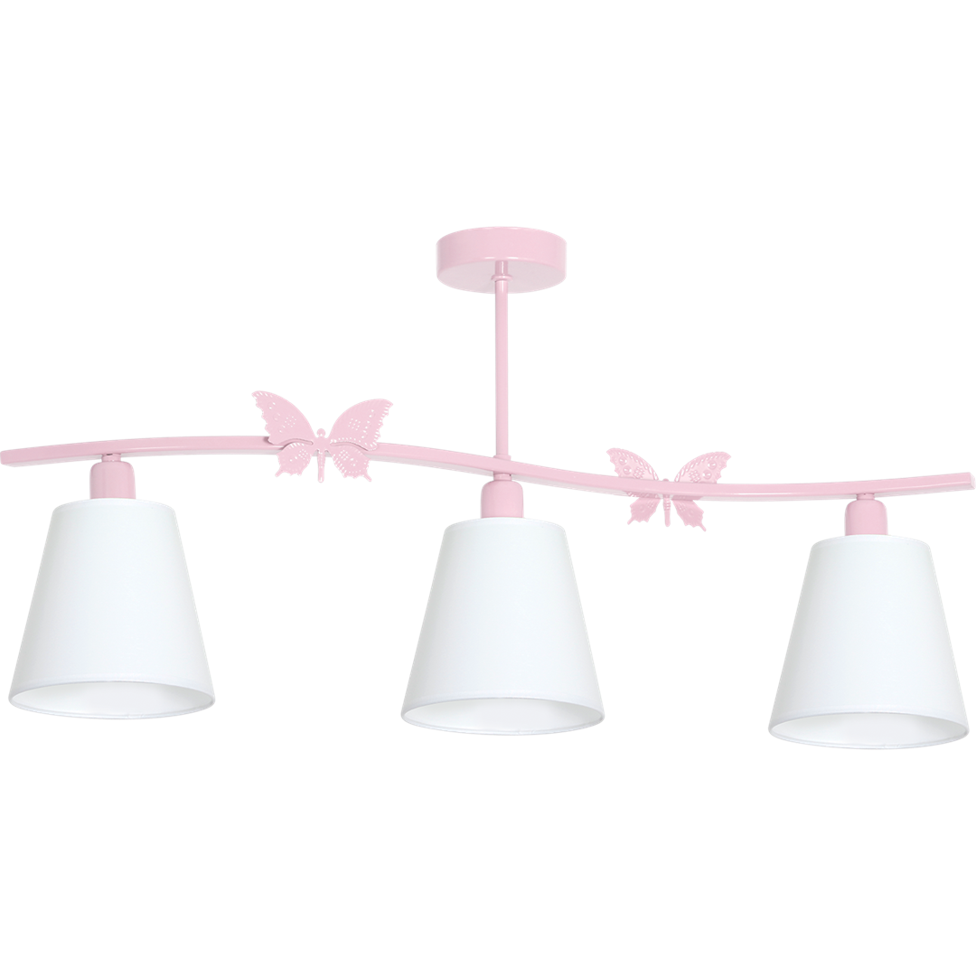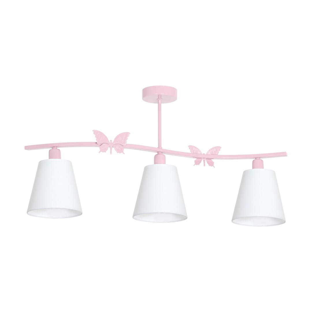 Lampa do pokoju dziewczynki ALICE PINK to nieszablonowa forma i oryginalny styl - różowa lampa z trzeba białymi kloszami wykończonymi w pudrowym różu sprawdzi się zarówno we wnętrzach klasycznych, jak i nowoczesnych. Delikatny różowy odcień oraz estetyczne zdobienia w kształcie motyli sprawiają, że lampa dla dziewczynki będzie uroczą ozdobą w pokoju dziecięcym.