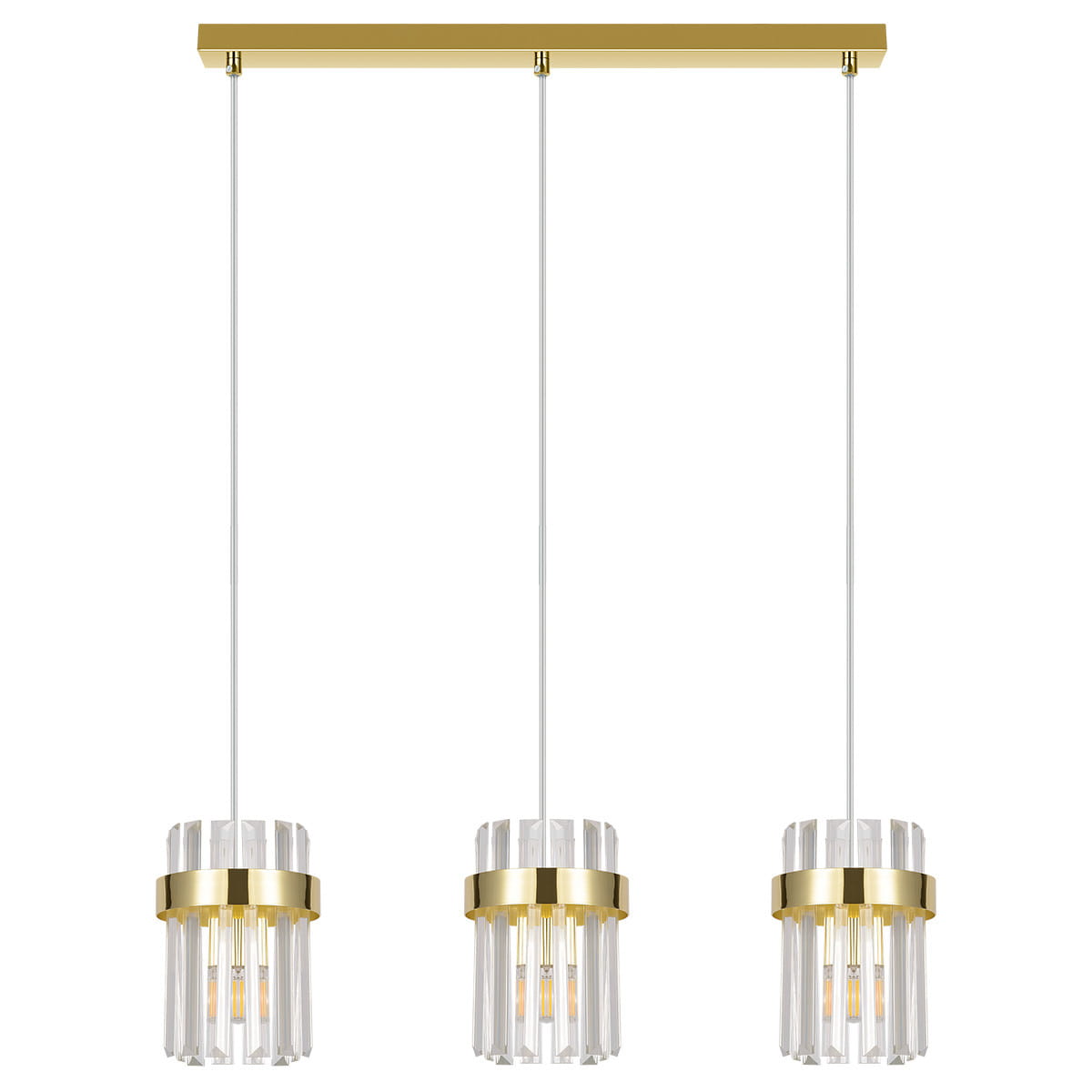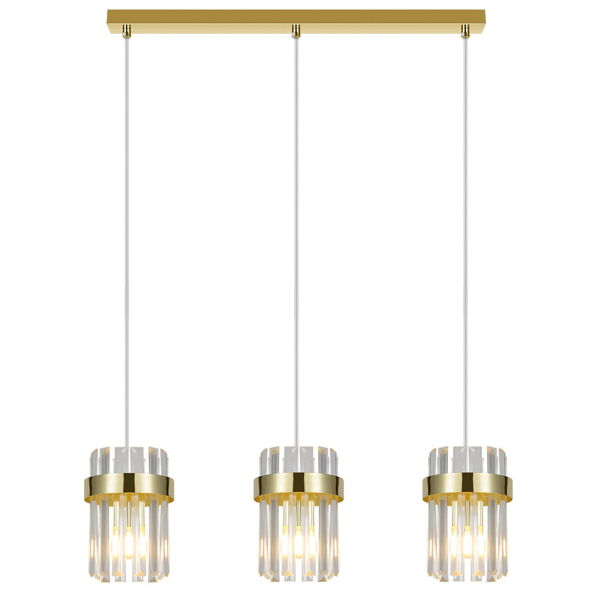 Złota lampa wisząca potrójna z kryształami 150 cm 3xE14 VETRO - lampa wisząca potrójna złota, elegancka lampa wisząca nad stół do jadalni, lampa do salonu, lampa nad wyspę kuchenną. Lampa wisząca złota z akrylowymi kryształami oświetli i ozdobi stylowe wnętrza, pięknie zaprezentuje się jako lampa glamour.