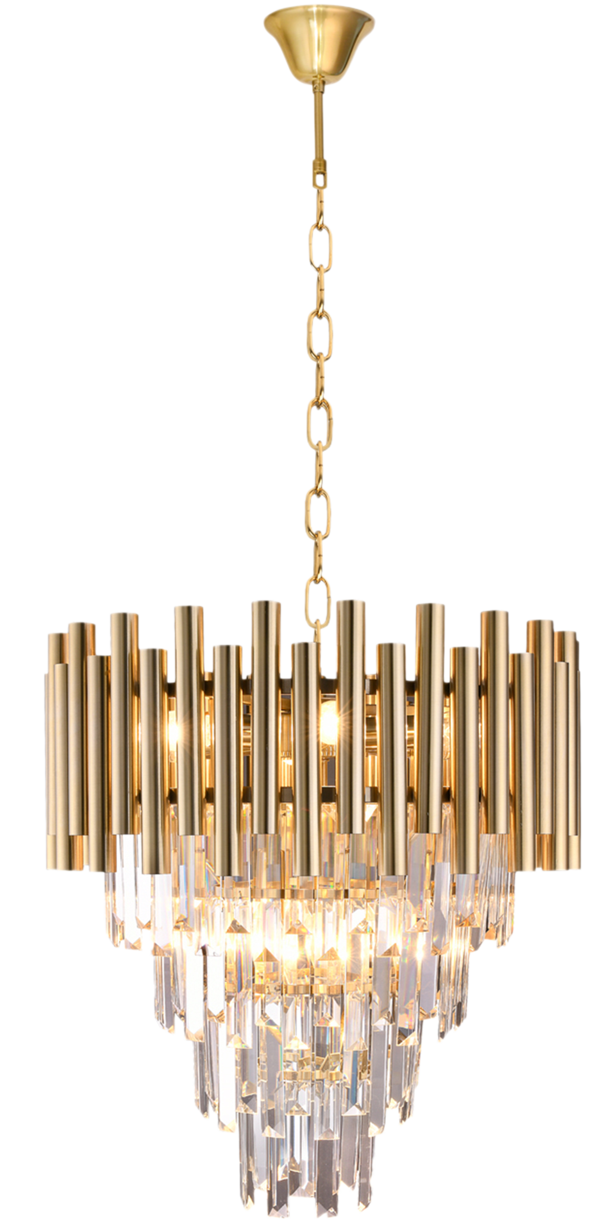 Złoty żyrandol nowoczesny charakteryzuje się nietuzinkowym designem. Nowatorskie połączenie kryształów z geometrycznymi rurkami zadowoli nawet najbardziej wymagających klientów, szukających oryginalnych dodatków do wnętrz. Elegancka lampa wisząca złota MADISON GOLD została wykonana z wysokiej jakości metalu oraz kryształu.
