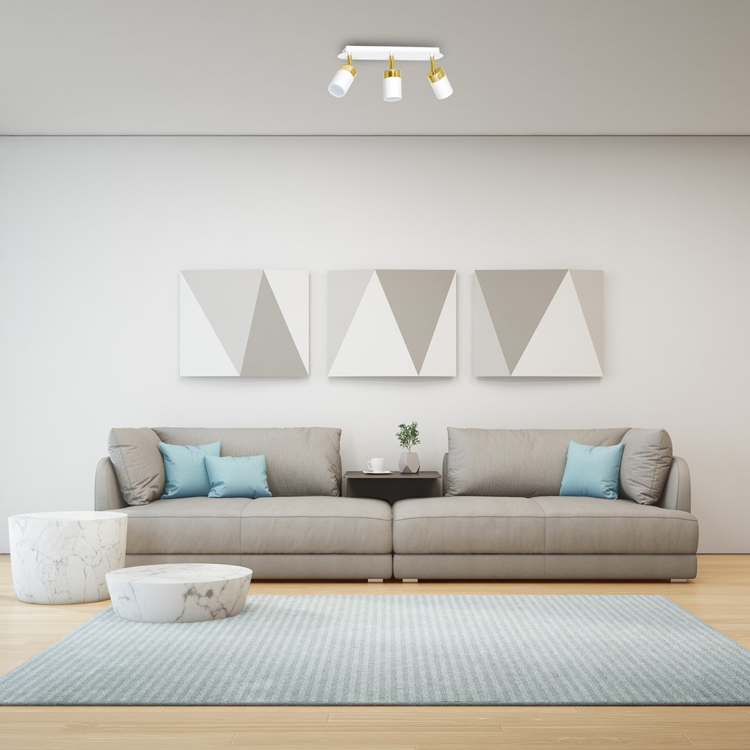 Lampa sufitowa potrójna regulowana biała ze złotym wykończeniem idealna dla miłośników minimalistycznych rozwiązań w modnych tonacjach kolorystycznych.