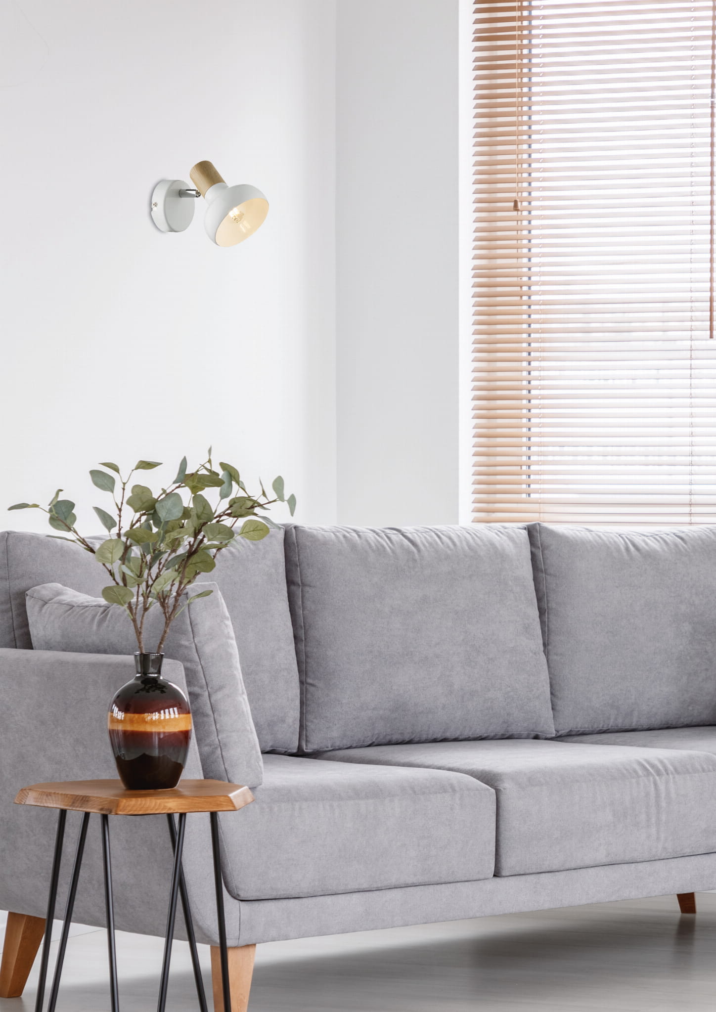 Biały kinkiet skandynawski 1XE14 40W PUERTO szykowne połączenie metalowego klosza z dekoracyjną nadkloszówką imitującą drewno. Kinkiet ścienny z możliwością regulacji kąta nachylenia klosza połączonego chromowym dystansem.