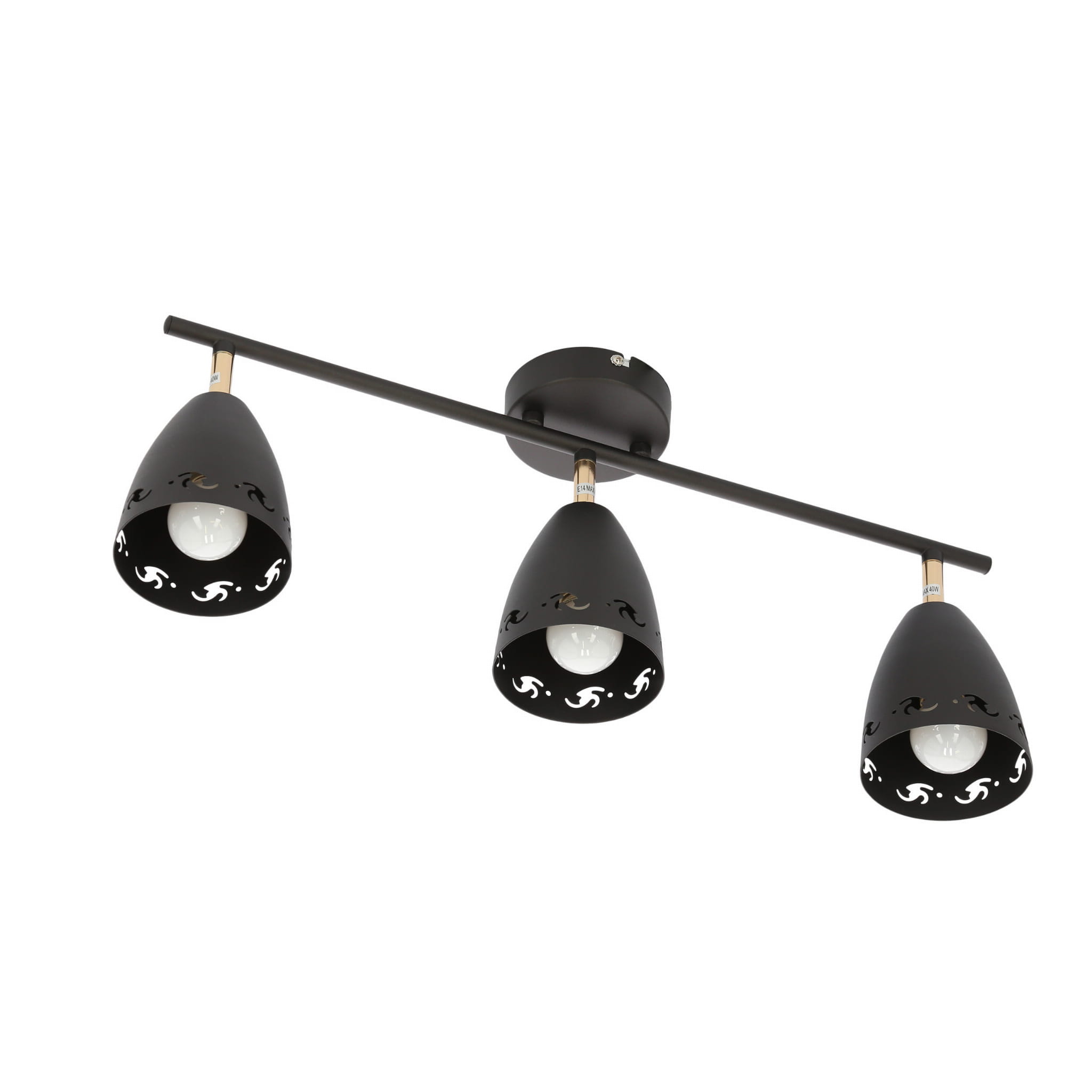 Czarna lampa sufitowa dziecięca listwa COTY 3XE14 40W - matowa czerń będzie świetnym kontrastem dla kolorów w każdym wnętrzu, metalowe klosze efektywnie kierunkują strumień światła. Czarna lampa sufitowa posiada dekoracyjne wycięcia na obrzeżach klosza, które dodają efektów świetlnych oraz możliwość regulacji kąta nachylenia klosza w pionie i poziomie.