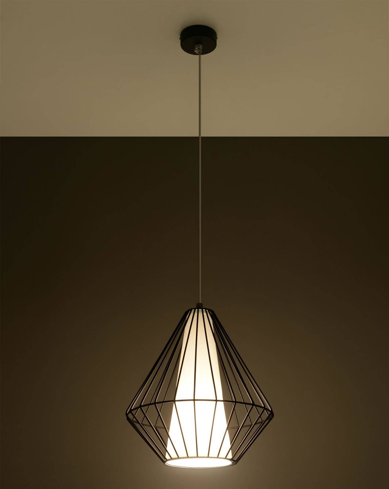 Czarna lampa wisząca pojedyncza 130 cm 1xE27 DEMI - dedykowana głównie dla osób ceniących styl nowoczesny i industrialny na przykład jako lampa nad stołem. Nowoczesna lampa wisząca czarna posiada stożkową oprawę otoczoną ozdobną, stalową klatką w formie fasetowanego diamentu. Taki design idealnie sprawdza się we wnętrzach nowoczesnych, minimalistycznych i loftowych. Minimalistyczna lampa wisząca o niebanalnym kształcie przyciąga uwagę i nadaje aranżacji industrialnego klimatu.