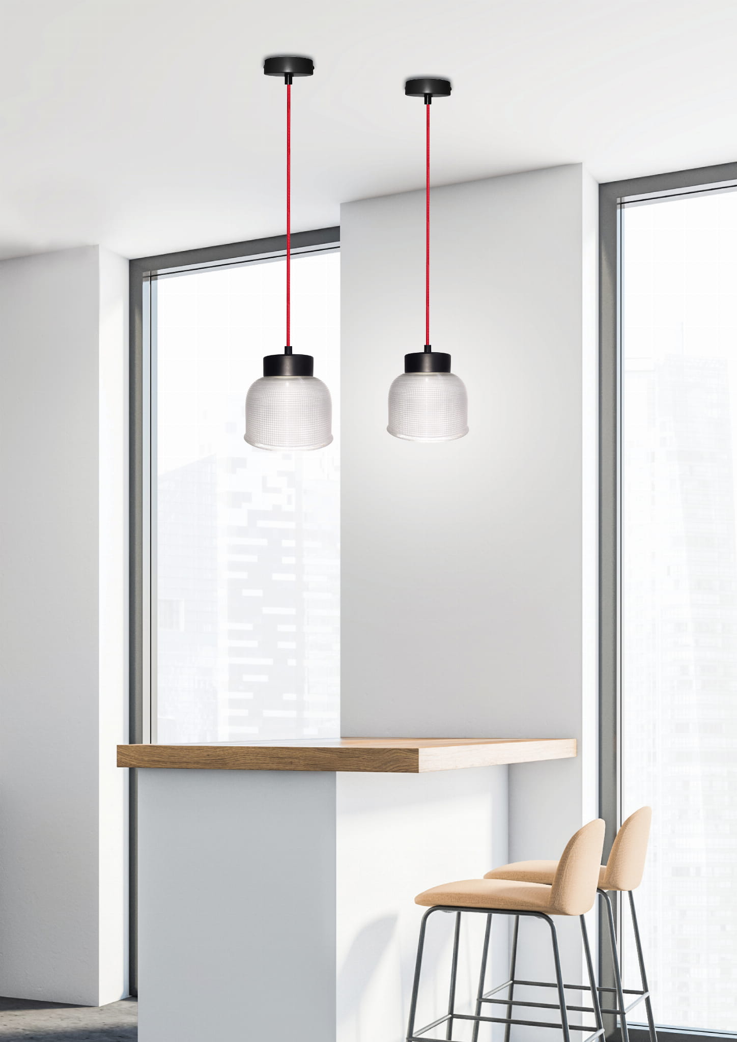 Czarna z czerwonym lampa wisząca pojedyncza ryflowana 1XE27 LIVERPOOL 1 lampa wisząca z ryflowanym kloszem, inspirowana stylistyką lat 70, idealnie pasuje do klasycznych i eklektycznych wnętrz. Lampa do salonu, lampa do jadalni, lampa do kuchni, sypialni, gabinetu. Lampa wisząca nowoczesna z czerwonym przewodem o wielkości klosza 150 mm z jednym punktem świetlnym.
