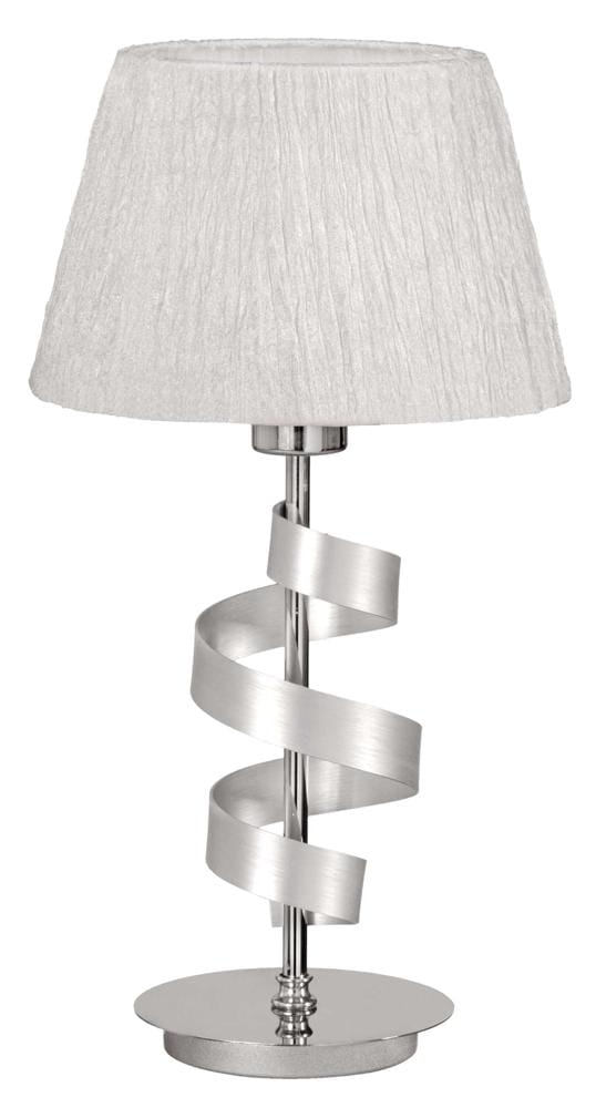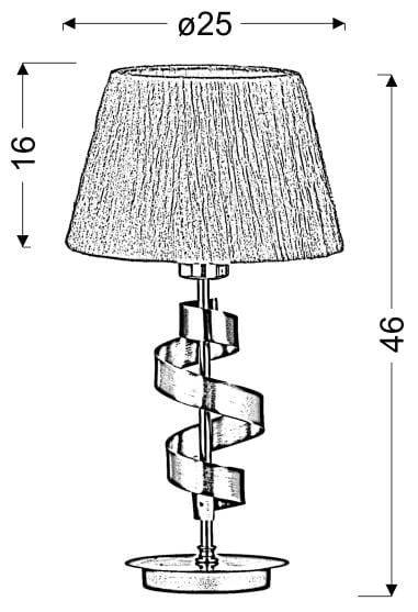 Elegancka lampa gabinetowa stojąca DENIS 1XE27 60W CHROM - chromowa podstawa o tradycyjnym kształcie i kunsztownym zdobieniu - metalową szarfą - w komplecie z białym kreszowanym abażurem. Lampa stojąca stołowa idealna do wnętrz wymagających odświeżenia aranżacji.