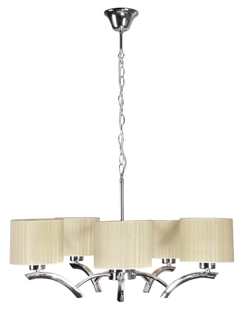 Elegancka lampa wisząca kremowa 5xE27 60W DRAGA - chromowa podstawa o wyszukanym kształcie w połączeniu z estetycznym abażurem tasiemkowym w kolorze kremowym, idealny do klasycznych wnętrz z tradycyjnym wystrojem.