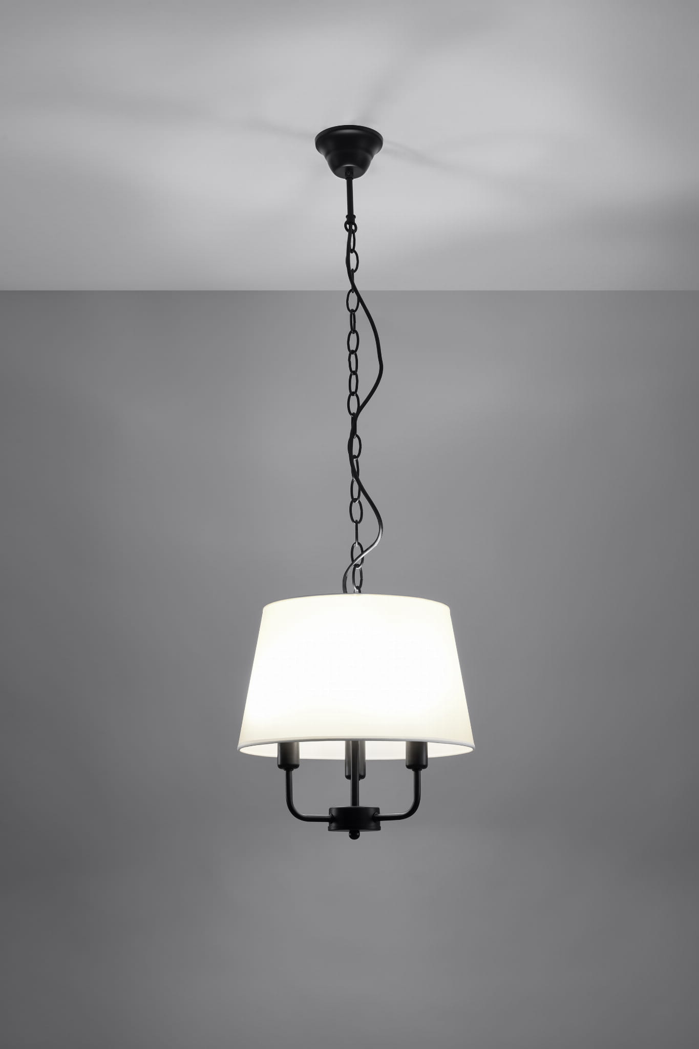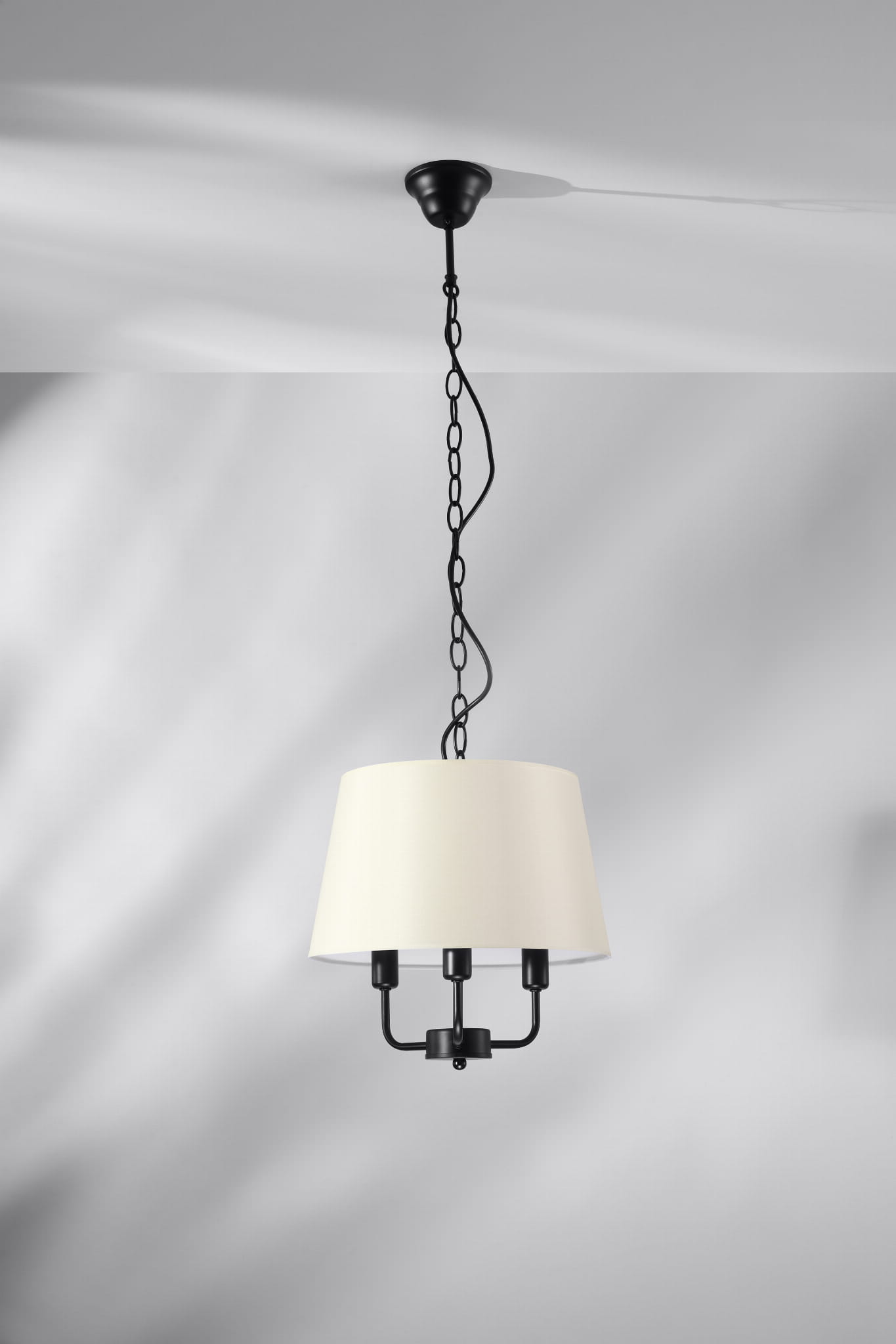 Elegancki żyrandol do salonu 3xE14 40W PASTERI - lampa wisząca do wnętrz urządzonych w duchu stylu vintage. Żyrandol nad okrągły stół, lampa wisząca do salonu - metalowe ramiona z żarówkami ukryte za beżowym abażurem - całość zawieszona na czarnym łańcuchu.