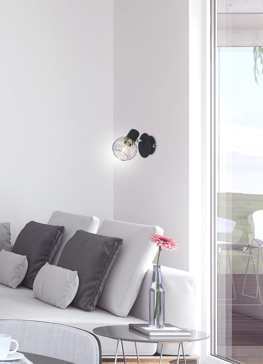 Kinkiet czarny chrom OSLO 1xE14 40W połączenie dwóch kolorów - czarna podstawa i srebrny ażurowy klosz w kształcie wycinka kuli - idealnie przejrzysty. Kinkiet na korytarz, kinkiet do salonu posiada standardowo możliwość regulacji kąta nachylenia.