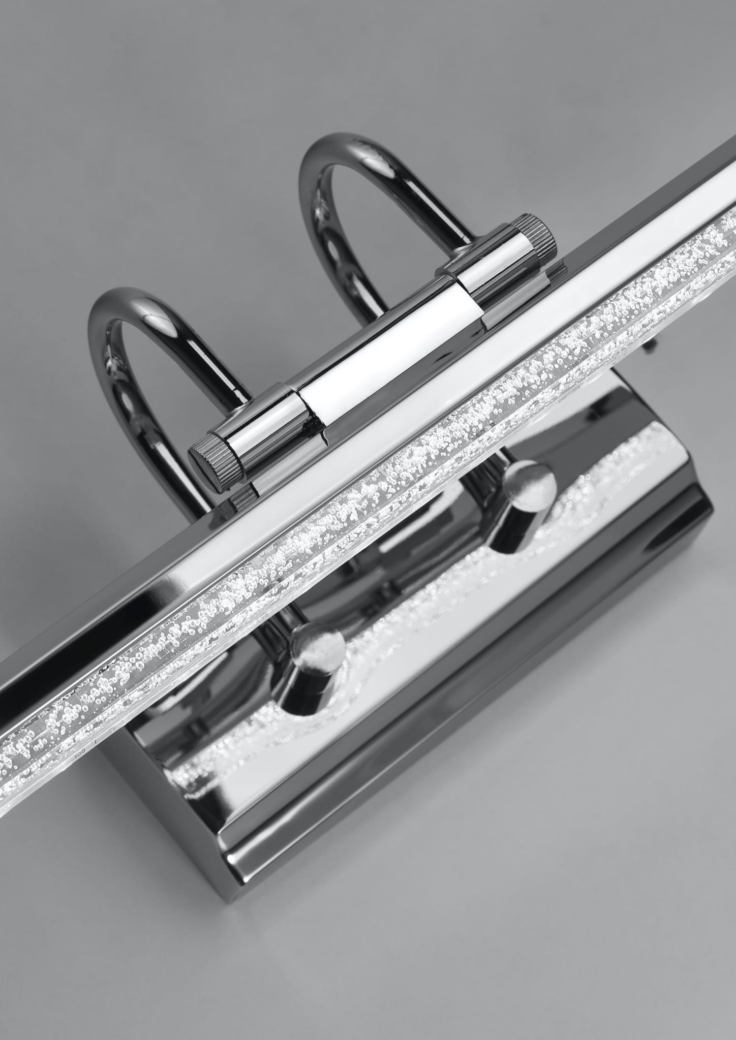 Kinkiet nad lustro ledowy chromowy 4000K 7W GIZEL - stylowa kombinacja chromu z transparentnym akrylem, wewnątrz akrylowego klosza dekoracyjne pęcherzyki powietrza, szczególnie wyraziste po zaświeceniu oprawy, imponująco odbijające się w lustrzanej powierzchni chromowej podstawy. Kinkiet ledowy obrazowy posiada ruchome połączenie ramienia z kloszem umożliwiające regulację kąta padania światła. Idealna propozycja jako kinkiet nad lustro.