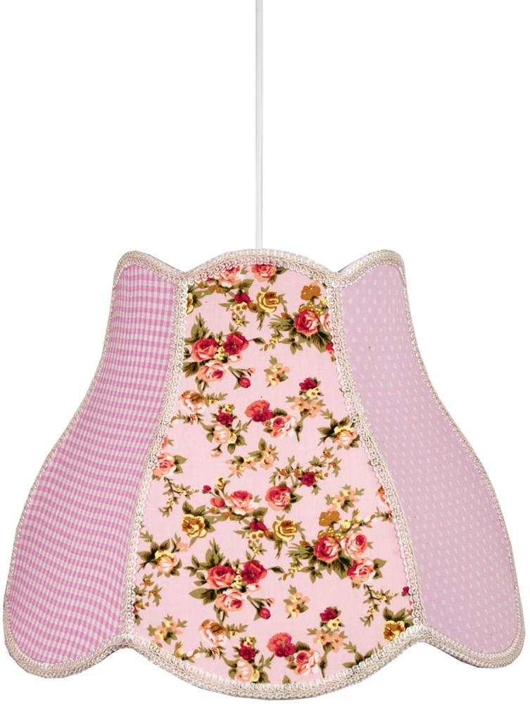 Lampa dziecięca wisząca różowa 1xE27 60W ZUZA - przykuwająca uwagę kolorystyka i oryginalny kształt. Lampa dla dziewczynki z tkaniny w trzech różnych wzorach - cudowne pasmanteryjne zdobienia w białym kolorze. Różowa lampa wisząca dedykowana dla miłośników subtelnych i pastelowych wnętrz sypialnianych oraz uzupełnienia pokoju dziecięcego. Różowa lampa wisząca dla dziewczynki.