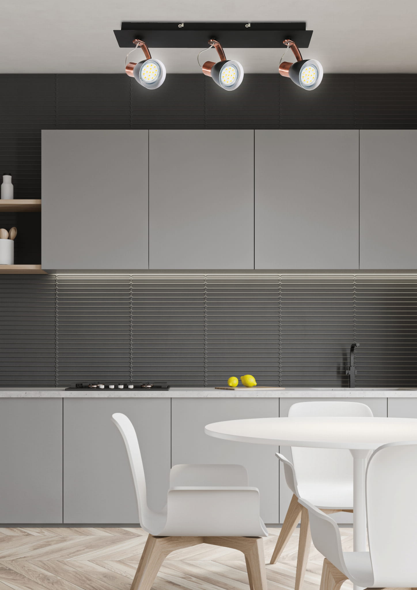 Lampa przysufitowa listwa czarny z miedzianym MARKUS 3XGU10 50W BEZ ŻARÓWKI elegancka matowa czerń uszlachetniona subtelną miedzią, elementem wyróżniającym są miedziane dystanse łączące klosze z podstawą oraz maskujące przewody sprężynki. Lampa przysufitowa posiada możliwość regulacji kąta nachylenia klosza w pionie i poziomie oraz idealnie rozświetli i wizualnie ociepli wnętrze. Lampa na korytarz, lampa do kuchni, lampa przysufitowa idealna nawet do mniejszych pomieszczeń.