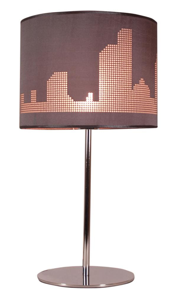 Lampa stojąca gabinetowa 1xE27 60W MANHATTAN designerska lampka gabinetowa połączenie chromowanej podstawy z szarym abażurem z wyciętym motywem miasta. Lampa stojąca do salonu, lampka do sypialni o nowoczesnym i praktycznym kształcie po podświetleniu tworzy ciekawe efekty świetlne.