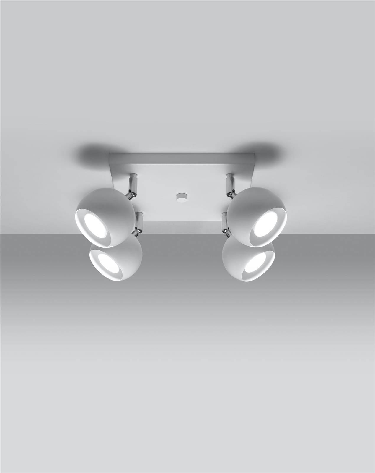 Lampa sufitowa biała regulowana 4xGU10 OCULARE 4 - połączenie minimalistycznego designu z najwyższą funkcjonalnością. Lampa sufitowa posiada regulowane przeguby, doskonale odnajdzie się w loftach oraz przestrzeniach urządzonych w stylach minimalistycznym oraz industrialnym. Lampa sufitowa do salonu, biała lampa do kuchni, lampa do przedpokoju. To propozycja również do ultranowoczesnych pokoi i salonów bądź przestrzeni biurowych, charakteryzujących się stonowaną kolorystyką i eleganckimi dodatkami.