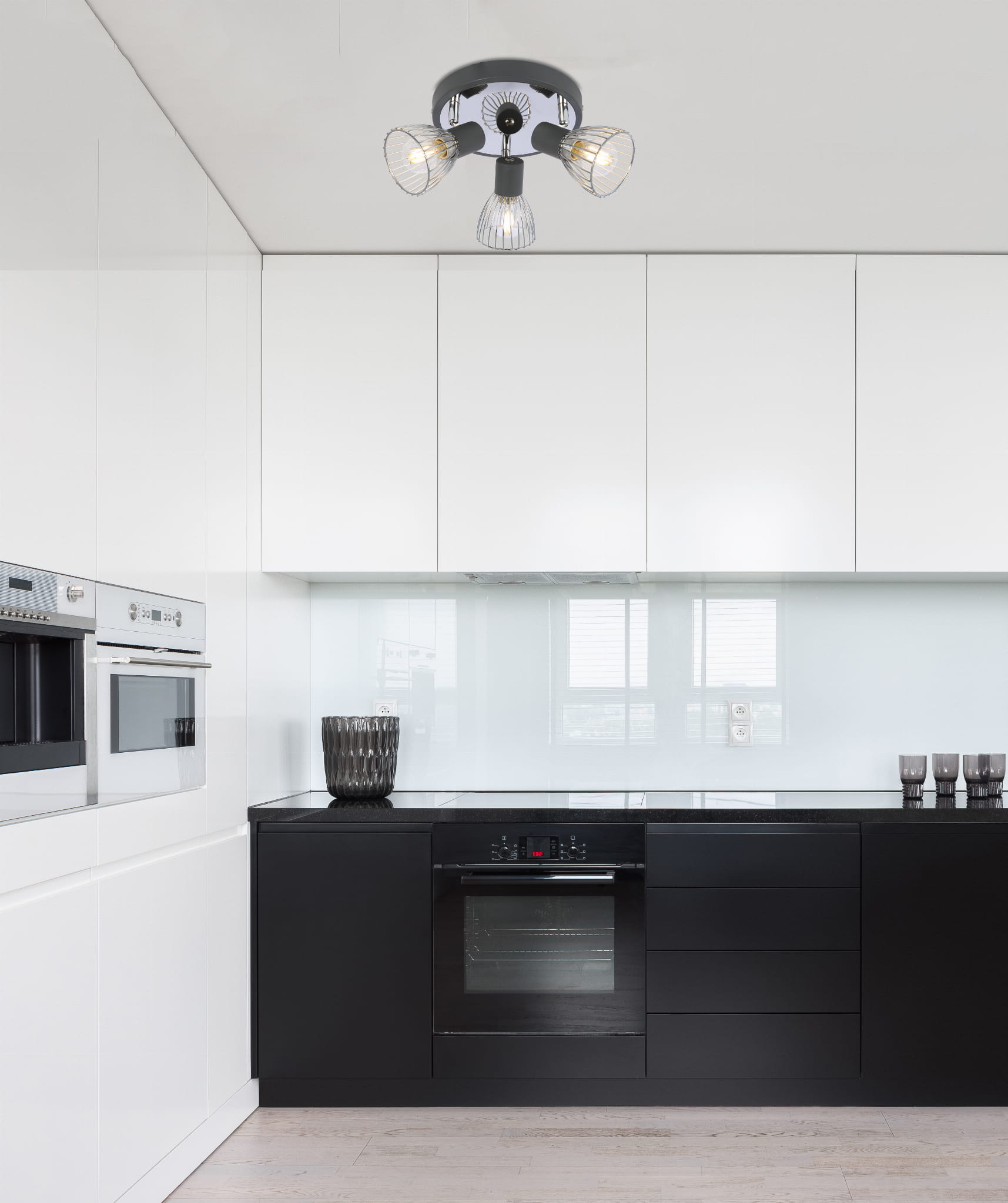 Lampa sufitowa plafon czarny chrom 3xE14 40W MODO ekskluzywna wersja eleganckiej prostoty, nowoczesna lampa sufitowa wykończona w czerni z chromową nakładką, w której efektownie odbija się ażurowy abażur, zapewniający maksymalne wykorzystanie mocy źródła światła. Lampa sufitowa posiada możliwość regulacji kąta nachylenia, niezastąpiony jako lampa w przedpokoju, lampa na korytarz, sprawdzi się również w niskich pomieszczeniach.