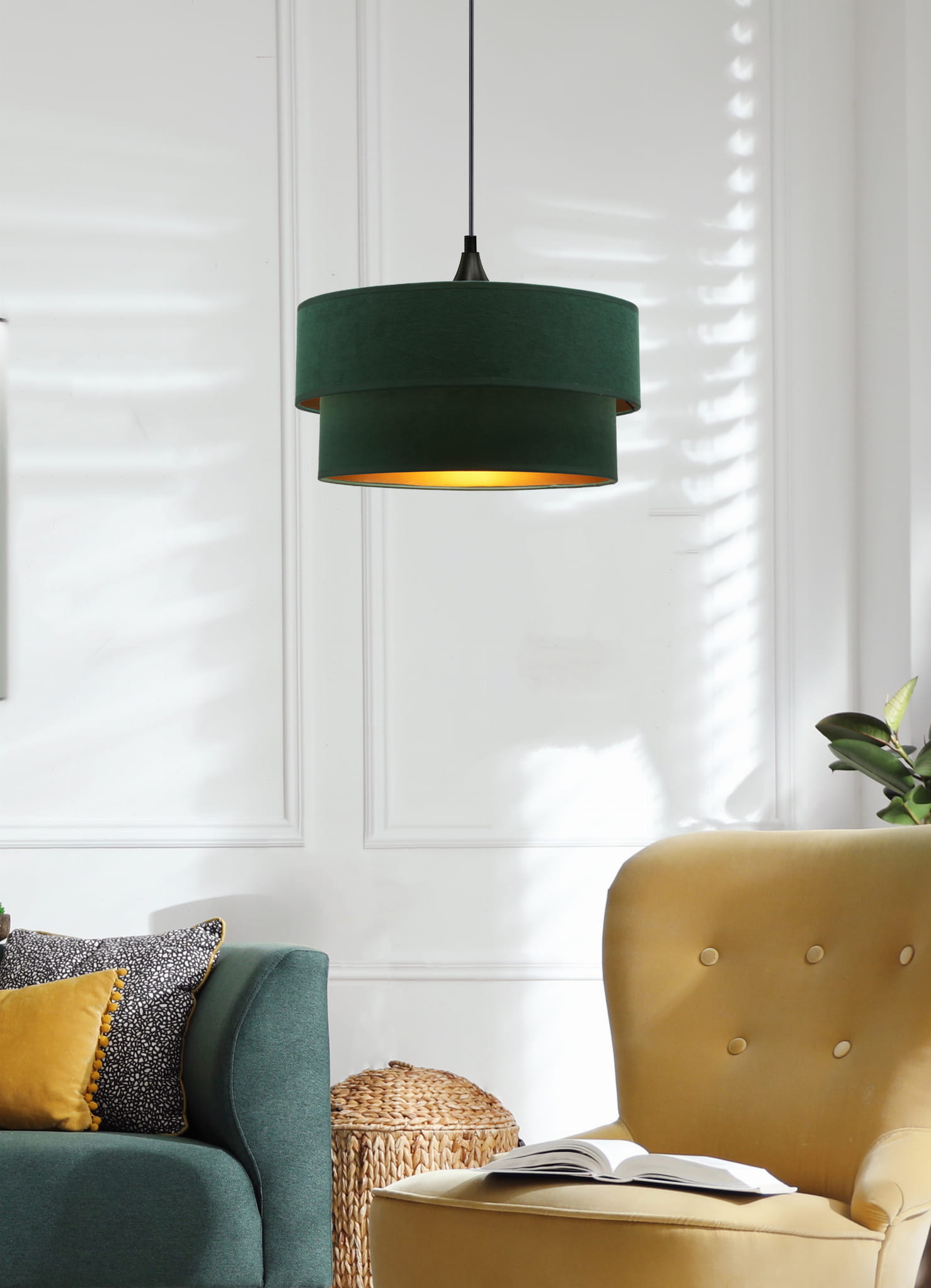 Lampa wisząca butelkowa zieleń ze złotym 1xE27 60W SCOPELLO - lampa wisząca do salonu w modnej, eleganckiej kolorystyce butelkowej zieleni z dodatkiem czarnego i złotego wykonana z weluru. Elegancka lampa nad stół do jadalni - pojedyncza lampa wisząca do stylowego salonu, lampa do sypialni w eleganckim nasyconym kolorze.