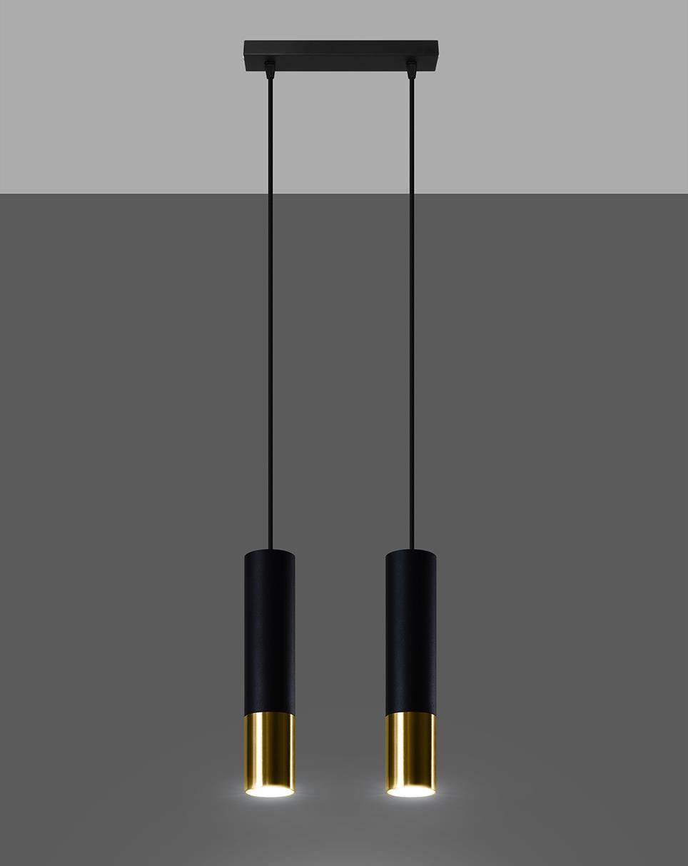 Lampa wisząca czarna ze złotym tuby sufitowe podwójne 2xGU10 LOOPEZ 2 - mniej znaczy więcej, a lampa wisząca czarna ze złotym tuby sufitowe podwójne LOOPEZ jest tego najlepszym przykładem. Klasyczna elegancja spotyka się z nowoczesnym minimalizmem, matowa czerń kontrastuje ze złotym. Jak najlepsza biżuteria lampa wisząca czarna ze złotym podkreśla piękno wnętrza, rzucając światło punktowe jako lampa nad stół, lampa nad wyspę kuchenną.