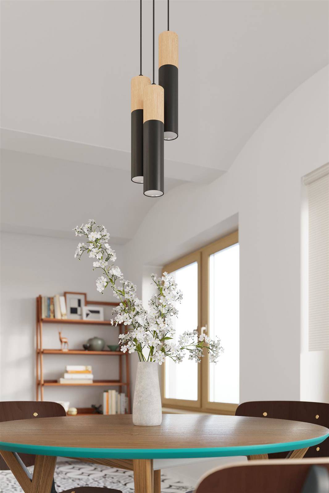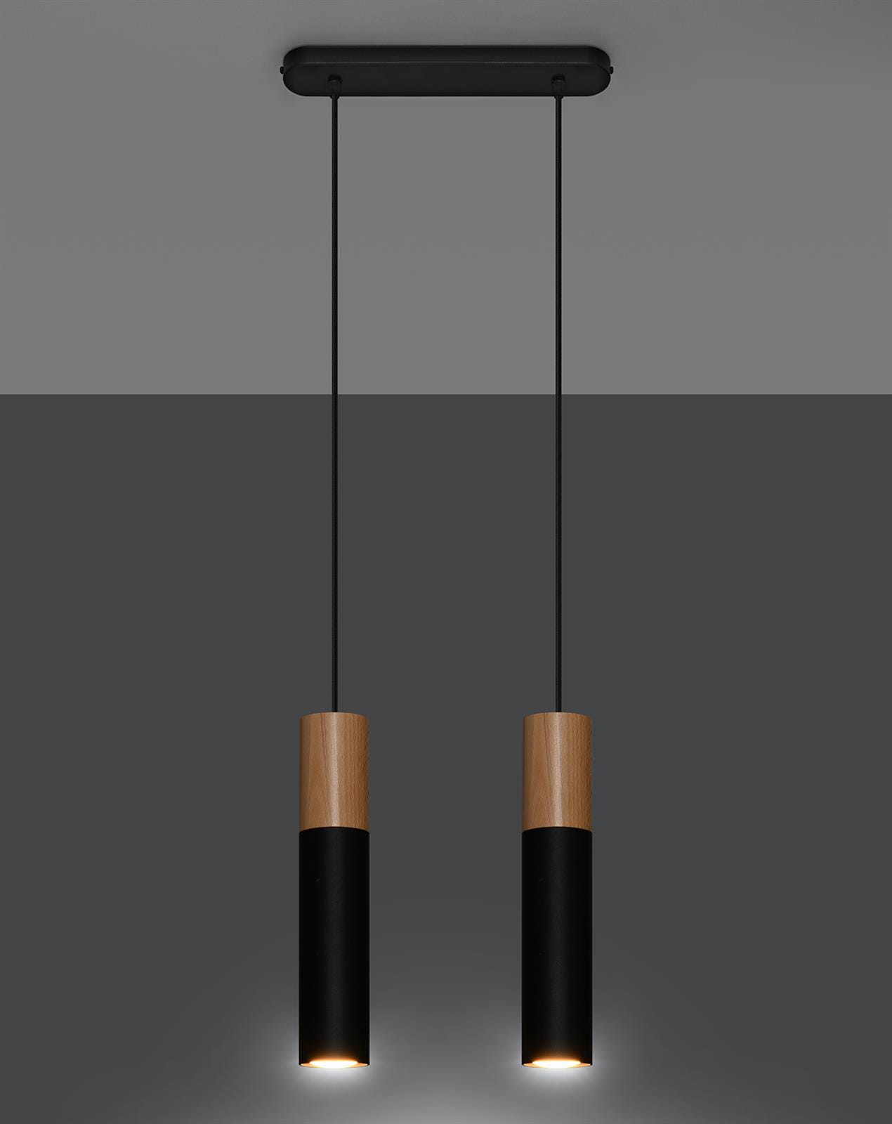 Lampa wisząca podwójna tuby sufitowe czarne z drewnem 2xGU10 PABLO 2 - lampa wisząca podwójna łącząca czerń z ciepłym odcieniem drewna do jasnych, skandynawskich wnętrz oraz nowocześnie urządzonych pomieszczeń. Dzięki prostej formie lampa wisząca tuby sufitowe PABLO nie zdominuje swoją obecnością całego wystroju, lecz jedynie subtelnie go dopełni. Lampa nad wyspę kuchenną, lampa do jadalni - elegancka lampa wisząca podwójna punktowa.