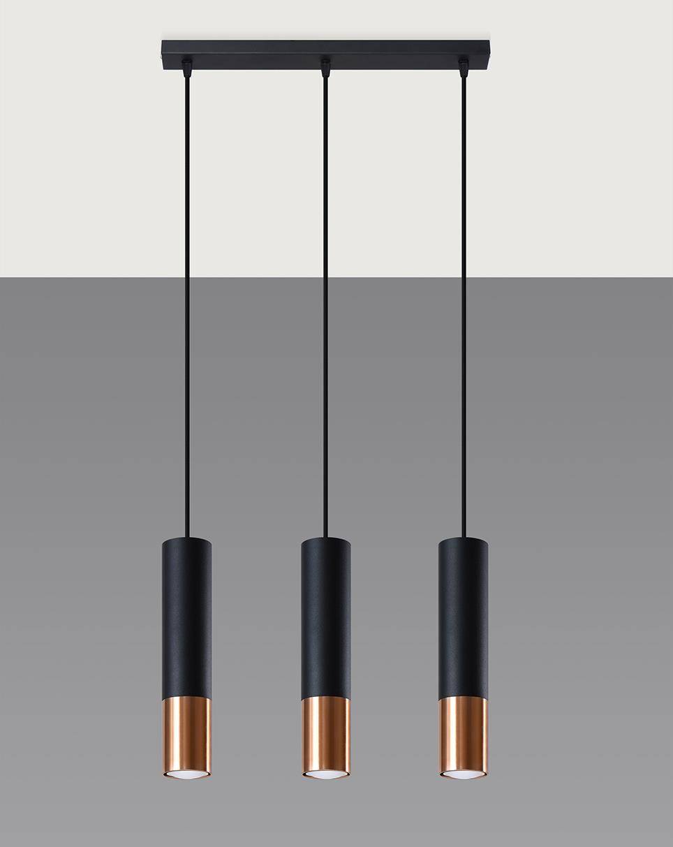 Lampa wisząca potrójna czarna z miedzianym tuby sufitowe 3xGU10 LOOPEZ 3L - mniej znaczy więcej, a lampa wisząca czarna z miedzianym tuby sufitowe potrójne LOOPEZ jest tego najlepszym przykładem. Klasyczna elegancja spotyka się z nowoczesnym minimalizmem, matowa czerń kontrastuje z miedzianym. Jak najlepsza biżuteria lampa wisząca czarna z miedzianym podkreśla piękno wnętrza, rzucając światło punktowe jako lampa nad stół, lampa nad wyspę kuchenną.
