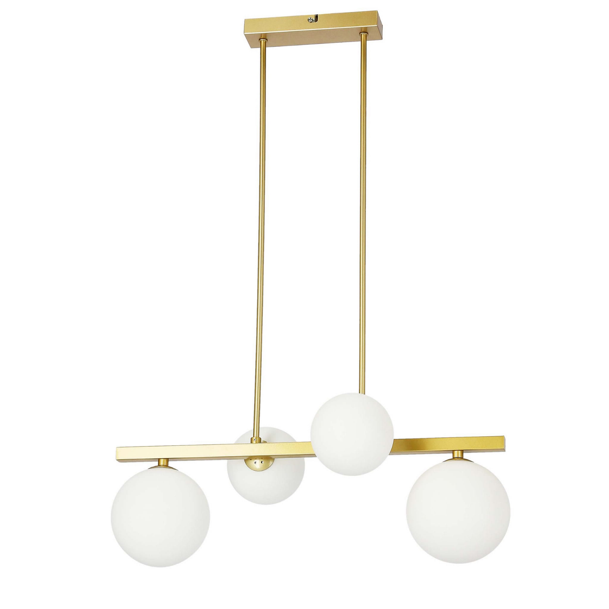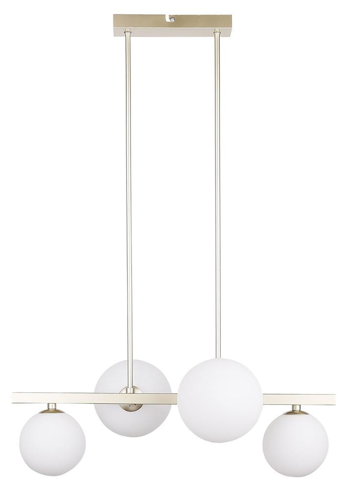 Lampa wisząca złota 4xG9 klosze białe kule KAMA - nowoczesny żyrandol z klasycznym charakterem. Wykonany z metalu, wykończony w efekcie mosiądzu. Cztery klosze białe kule mleczne nadają subtelnego wyrazu - żyrandol do salonu, żyrandol do jadalni. Lampa wisząca złota klosze białe kule - oświetla i zdobi!