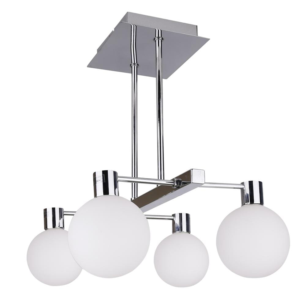 Srebrna lampa sufitowa wisząca sztyca klosze białe kule 4xG9 40W MALDUS CHROM - lampa do salonu, lampa nad stół do jadalni, lampa do sypialni w klasycznym wydaniu. Klosze białe kule zamocowane do chromowej podsufitki za pomocą sztywnych sztycy.