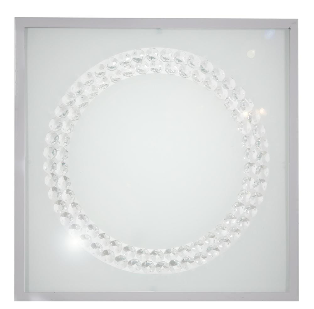 Plafon sufitowy ledowy satyna duży ring RING 29x29 16W 6500 K LED LUX płaski klosz z hartowanego szkła, regularny kształt kwadratu ozdobiony od strony wewnętrznej klosza dużym podwójnym okręgiem transparentnych kryształków. Plafon ledowy sufitowy o zimnej barwie światła LED - ozdobna lampa sufitowa ledowa na korytarz, lampa do kuchni.