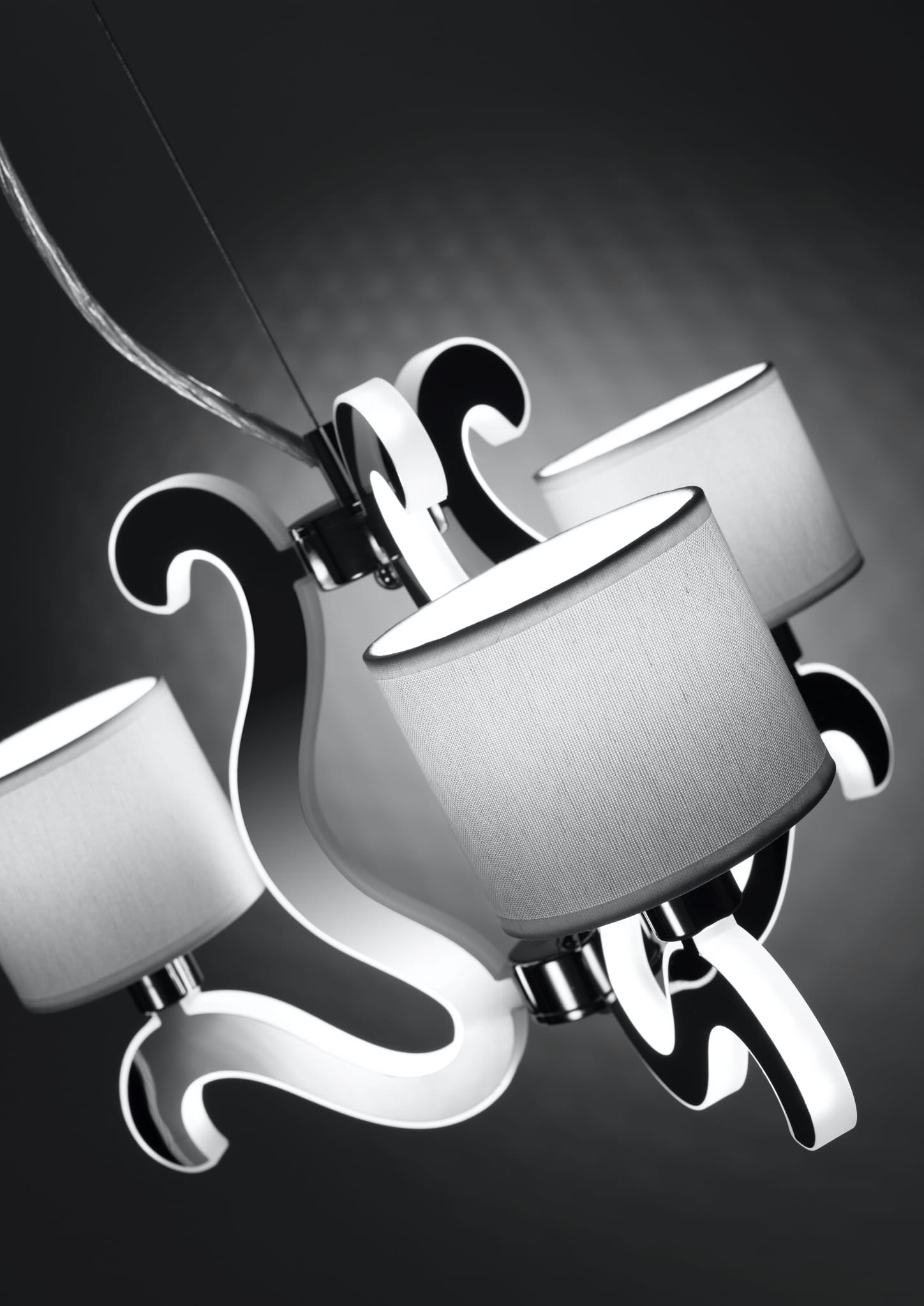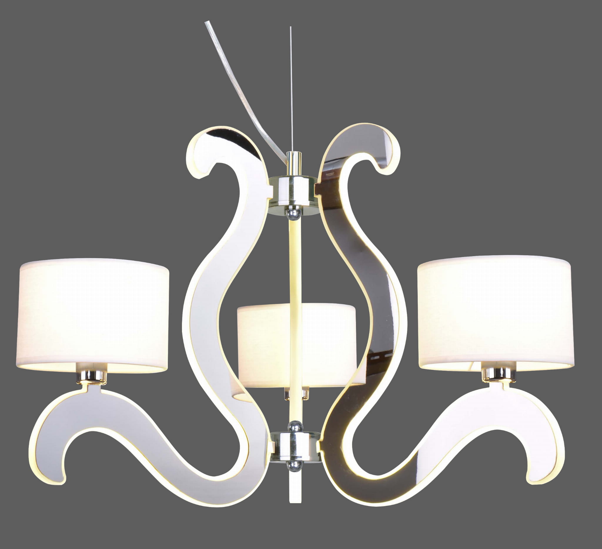 Srebrna lampa do salonu wisząca AMBROSIA 3 3XE14 40W + 18,4W LED CHROM - niezwykłe połączenie standardu z nowoczesnością; ponadczasowe białe płócienne abażury wykończone białą lamówką oraz designerskie ramionka z funkcją świecenia - w ramionkach za akrylową maskownicą schowany niewymienny LED o mocy 18,4W. Elegancka lampa do salonu srebrna dodatkowo posiada funkcjonalność pozwalająca na niezależne zaświecanie żarówek E14 i LED, lub obydwu jednocześnie. Sterowanie realizowane poprzez jednoobwodowy włącznik ścienny, przełączanie odbywa się taktowo poprzez kolejne WŁĄCZ/WYŁĄCZ.