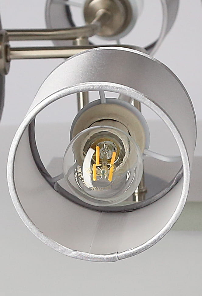 Srebrna lampa sufitowa SAX 6XE14 40W SATYNA - elegancka lampa sufitowa, walcowe abażury z tkaniny - od strony wewnętrznej usztywniane przez PCW. Szaro srebrna kolorystyka abażurów w połączeniu z klasyczną satyną tworzy współgrający zestaw, dedykowana do nowoczesnych wnętrz.