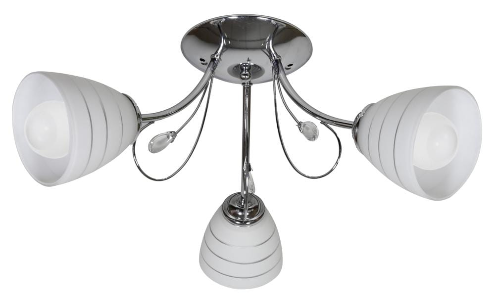 Srebrna lampa sufitowa SIMPLI 3XE27 40W CHROM Z KRYSZTAŁKIEM - ciesząca się niezwykłą popularnością klasyczna chromowa lampa sufitowa ze szklanymi kloszami. Lampa sufitowa zdobiona elementami dekoracyjnymi - metalowe finezyjne wygięcia, transparentne kryształki oraz chromowe paski na kloszach, całość spójna i estetyczna.