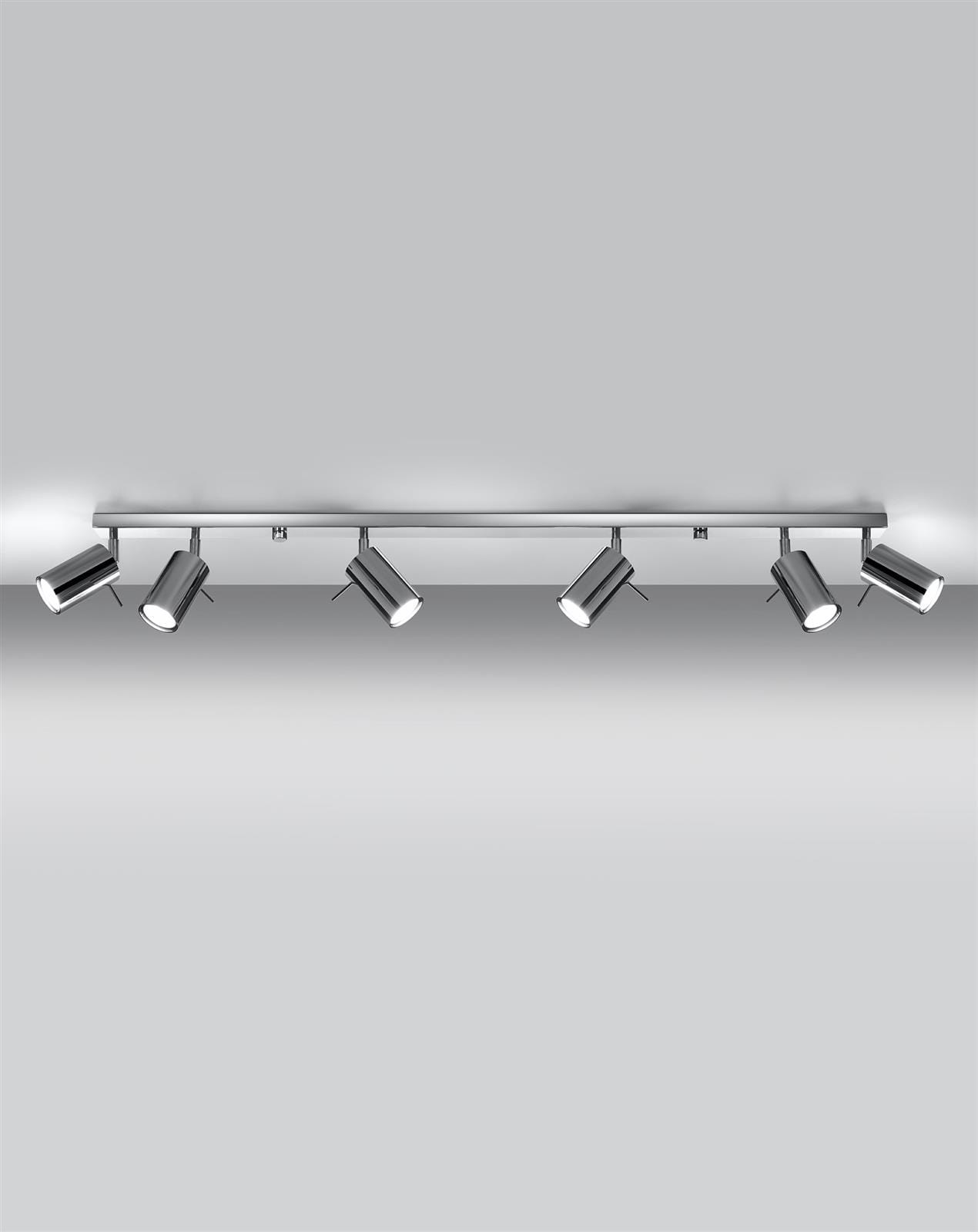 Srebrna lampa sufitowa regulowana listwa 6xGU10 chrom plafon RING 6L spot - połączenie minimalistycznego designu z najwyższą funkcjonalnością. Srebrna lampa sufitowa nowoczesna posiada chromowane przeguby, pozwalające na regulację promieni świetlnych. Lampa przysufitowa listwa srebrna RING doskonale odnajdzie się w loftach oraz przestrzeniach urządzonych w stylach minimalistycznym oraz industrialnym. Precyzja, z jaką została wykonana, stanowi o nienagannej prezencji i długowieczności.