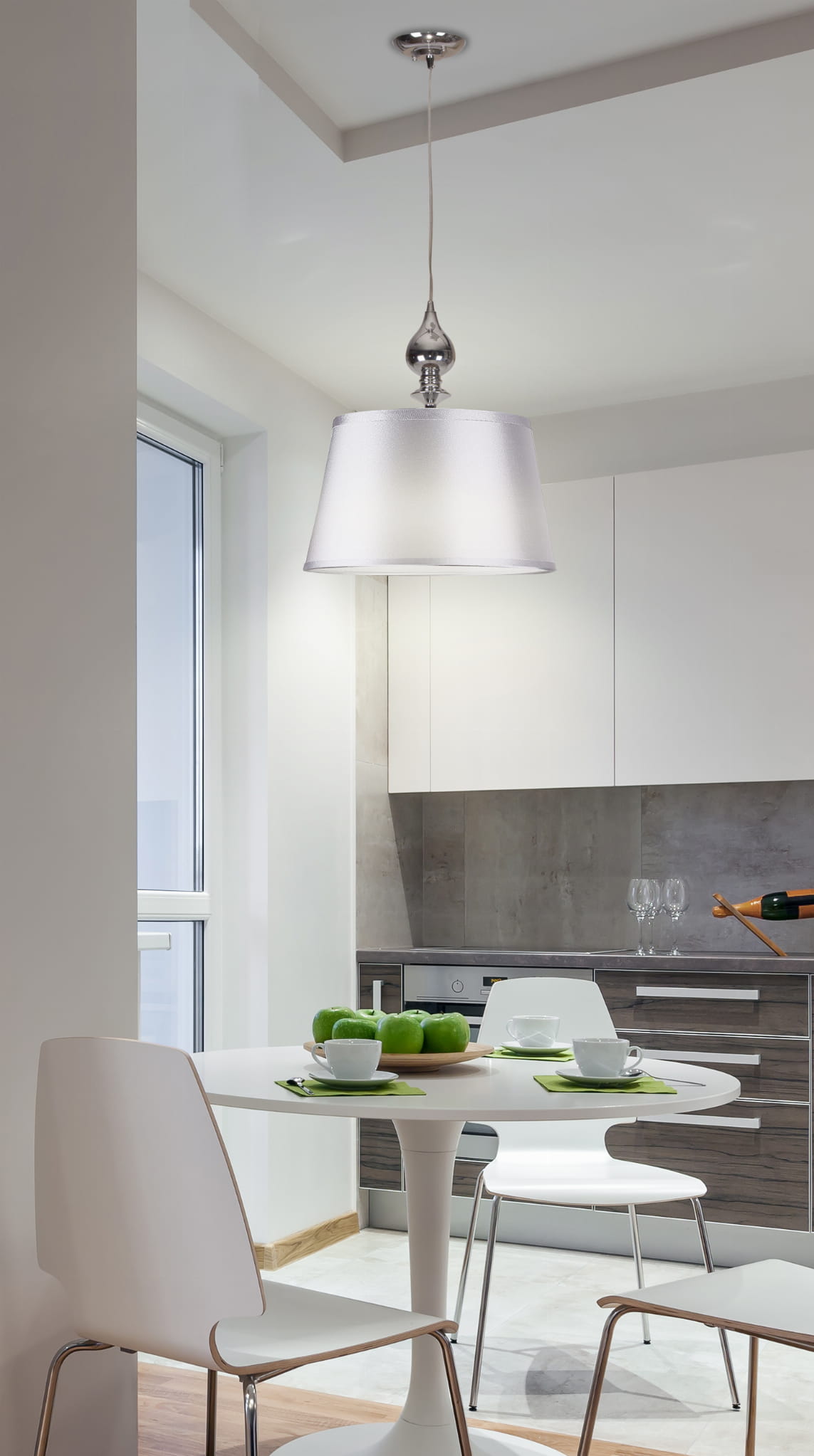 Srebrna lampa wisząca 120 cm PRIMA CHROM 1XE27 60W - efektowna lampa do salonu, lampa glamour w srebrnym kolorze. Lampa sufitowa wisząca do aranżacji gustownych i przemyślanych.