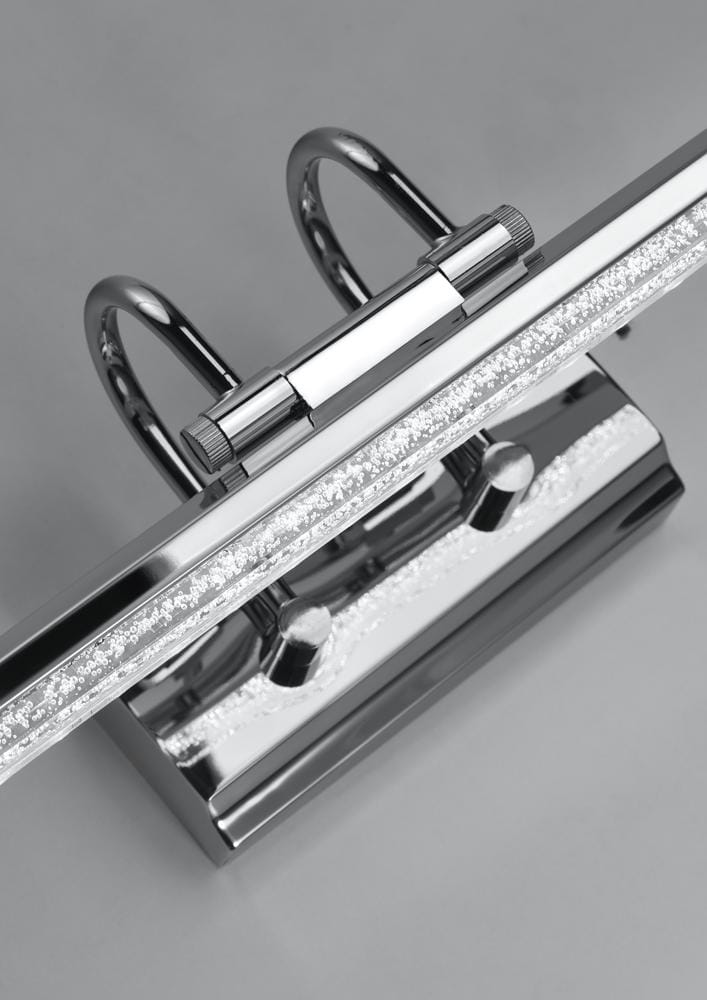 Srebrny kinkiet nad lustro ledowy GIZEL 5W LED CHROM stylowa kombinacja chromu z transparentnym akrylem - wewnątrz akrylowego klosza dekoracyjne pęcherzyki powietrza, szczególnie wyraziste po zaświeceniu oprawy, imponująco odbijające się w lustrzanej powierzchni chromowej podstawy. Kinkiet nad lustro posiada ruchome połączenie ramienia z kloszem umożliwia regulację kąta padania światła.