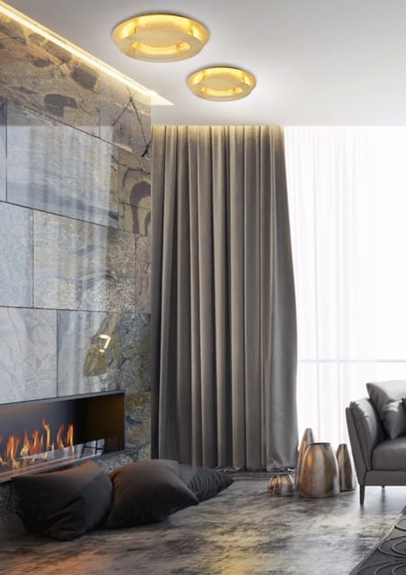 Złoty plafon ledowy 40 cm 3000K 18W MERLE dwupoziomowy, niezwykle efektowny plafon ledowy dedykowany nowoczesnym wnętrzom. Unikalna powierzchnia uzyskana w specjalistycznym procesie produkcji poprzez ręczne nakładanie płatków złoconej folii, prawdziwa ozdoba sufitu, optycznie ocieplająca wnętrze. Ekonomiczny LED ukryty po wewnętrznej stronie dolnego poziomu plafonu, nieosłonięty maskownicą gwarantuje maksymalizację strumienia świetlnego imponująco odbijającego się w płatkach złota.